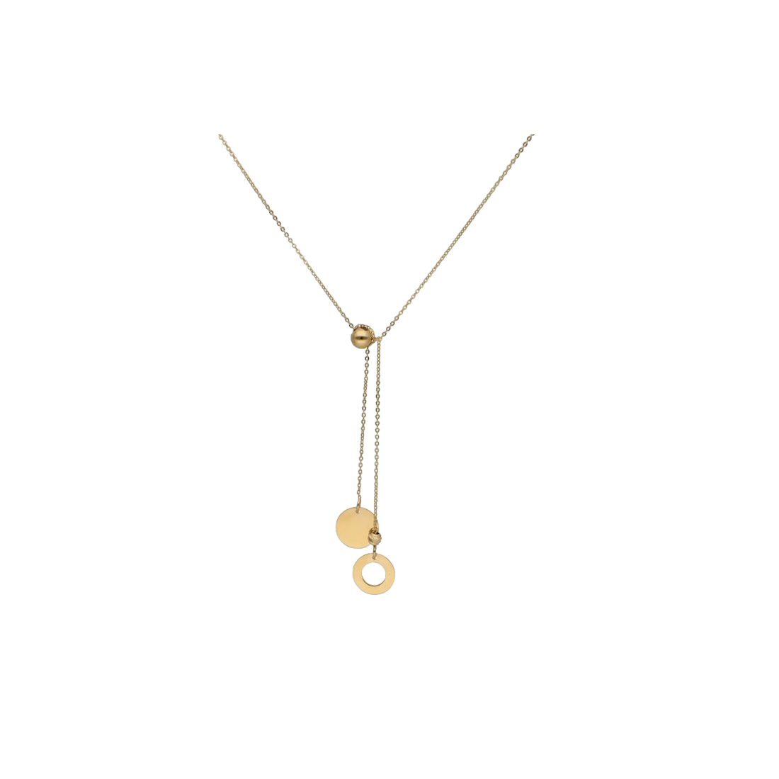 Chain necklace with two circle motifs, made entirely of 0.585 / 14 karat gold.