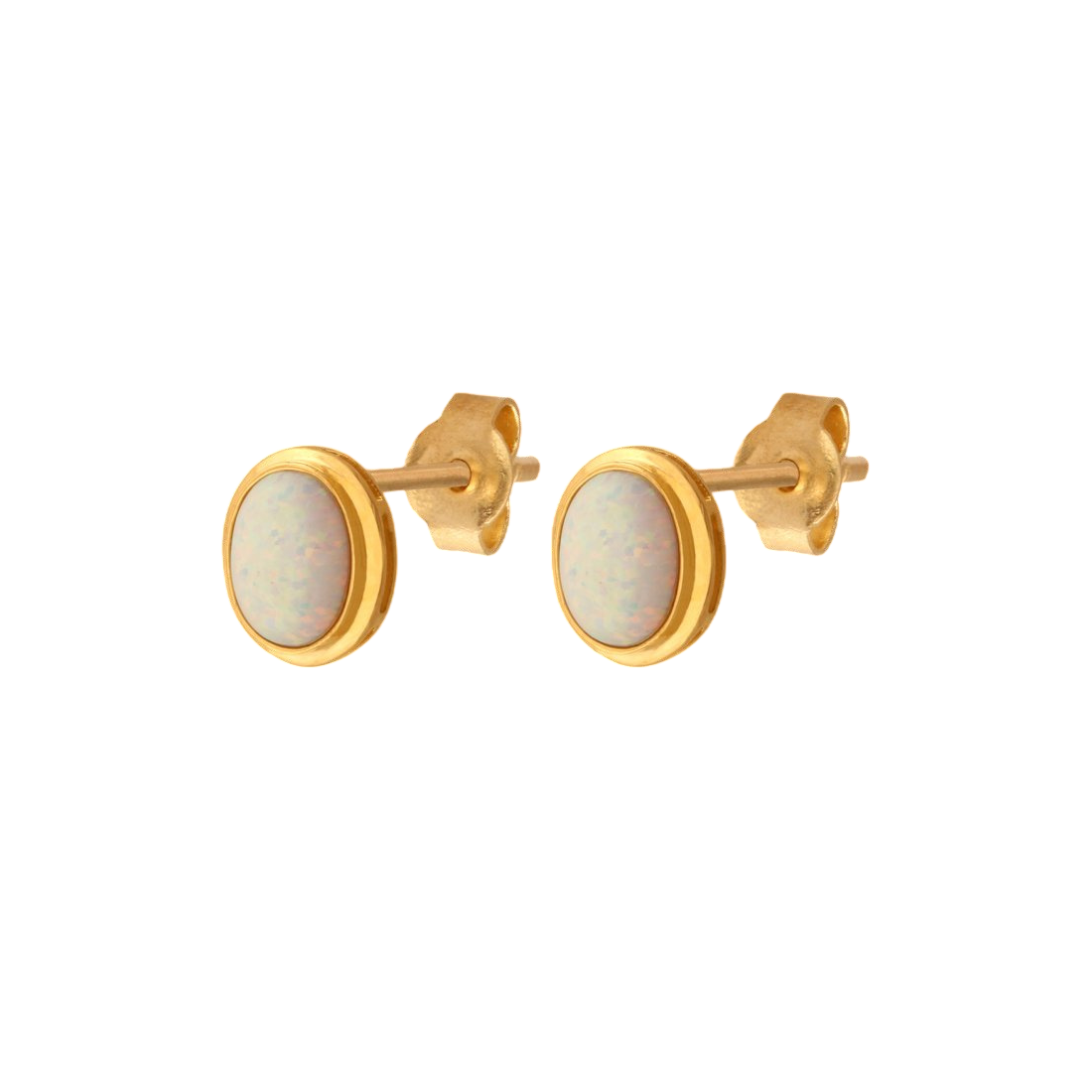 Earrings made entirely of 0.585 / 14 karat gold with synthetic opal in harlequin color.