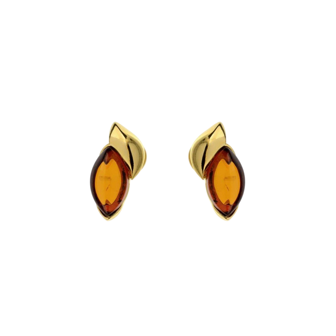 Stud earrings made entirely of gold-plated 925 silver with natural certified Baltic amber in cognac color.