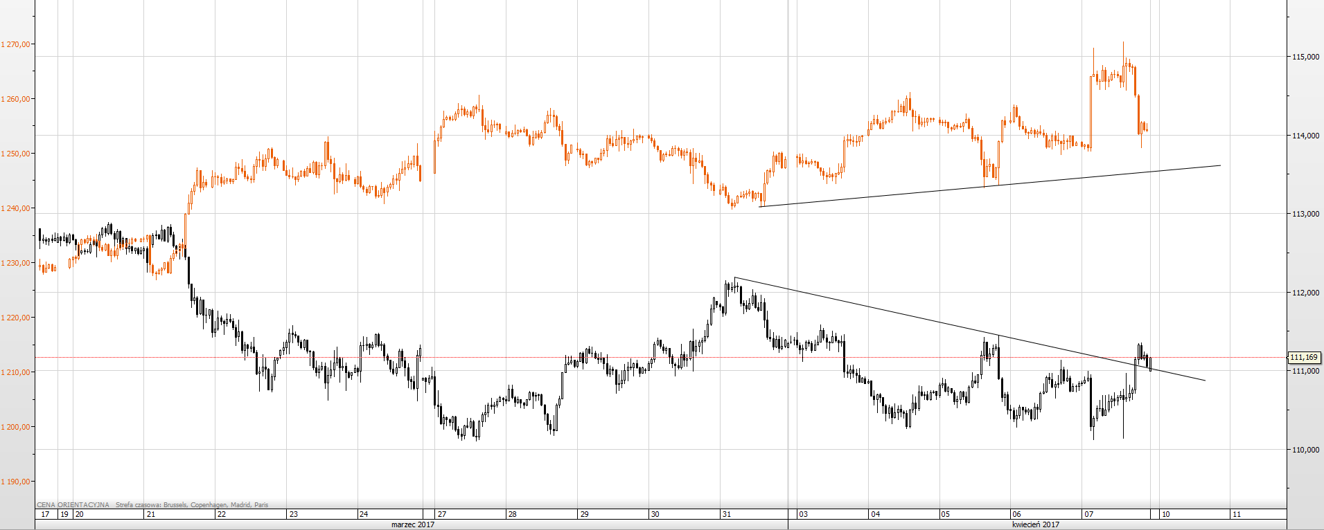 Wykres 1: Złoto (pomarańczowy wykres) oraz para walutowa USD/JPY (czarny wykres), interwał godzinowy