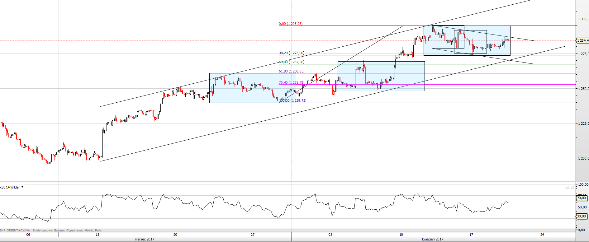 Z technicznego punktu widzenia złoto wykonało w ostatnich 5 sesjach techniczną korektę. Jej zasięg był zbliżony swoją rozpiętością do dwóch poprzednich (z końca marca oraz z pierwszej połowy kwietnia). Jest to dowód na to, że obecnie rynek złota porusza się wybitnie „technicznie”. Cena dodatkowo zatrzymała się na ważnym wsparciu wynikającym z poziomu Fibonacciego (38.2%). Piątkowe wzrosty metalu zatrzymały się na górnym ograniczeniu formacji flagi. Przełamanie tej linii da sygnał kupna i otworzy tym samym drogę do poziomu 1300 dol. za uncję. W przypadku pozytywnego dla rynku finansowego wyniku pierwszej tury wyborów we Francji, z dużym prawdopodobieństwem metal ponownie przetestuje średnioterminową linię trendu wzrostowego (okolice 1270 dol. za uncję).