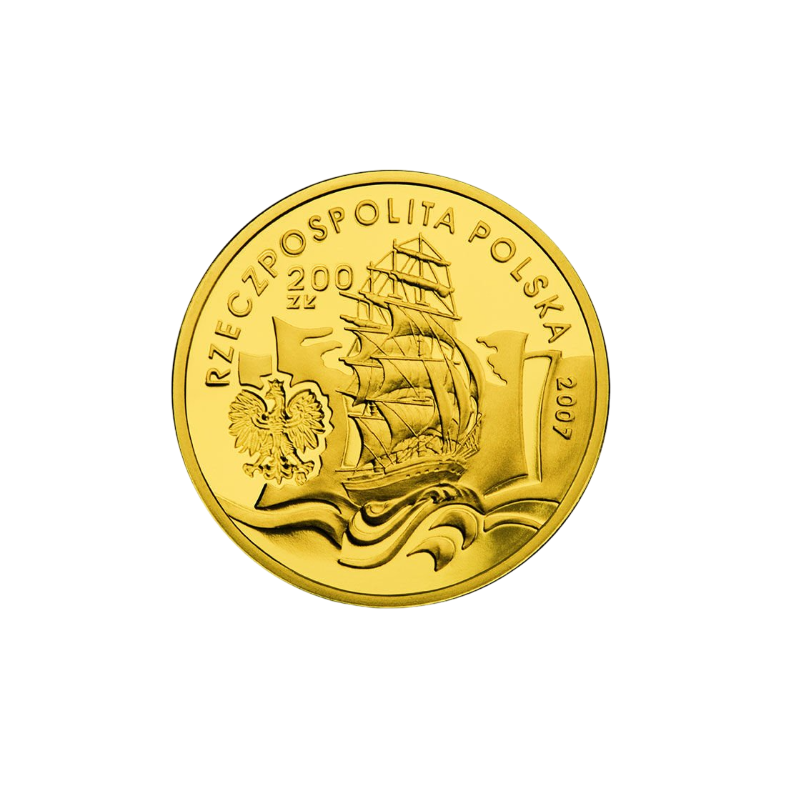 The obverse of the coin features a sailing ship under full sail – a reference to Konrad Korzeniowski's maritime career. In the background of the sailing ship, there is an outline of an open book, referring to his writing talent. The other elements of the obverse include the national emblem, the denomination (200 zł), the year of minting (2007), and the legend "Rzeczpospolita Polska" (Republic of Poland).