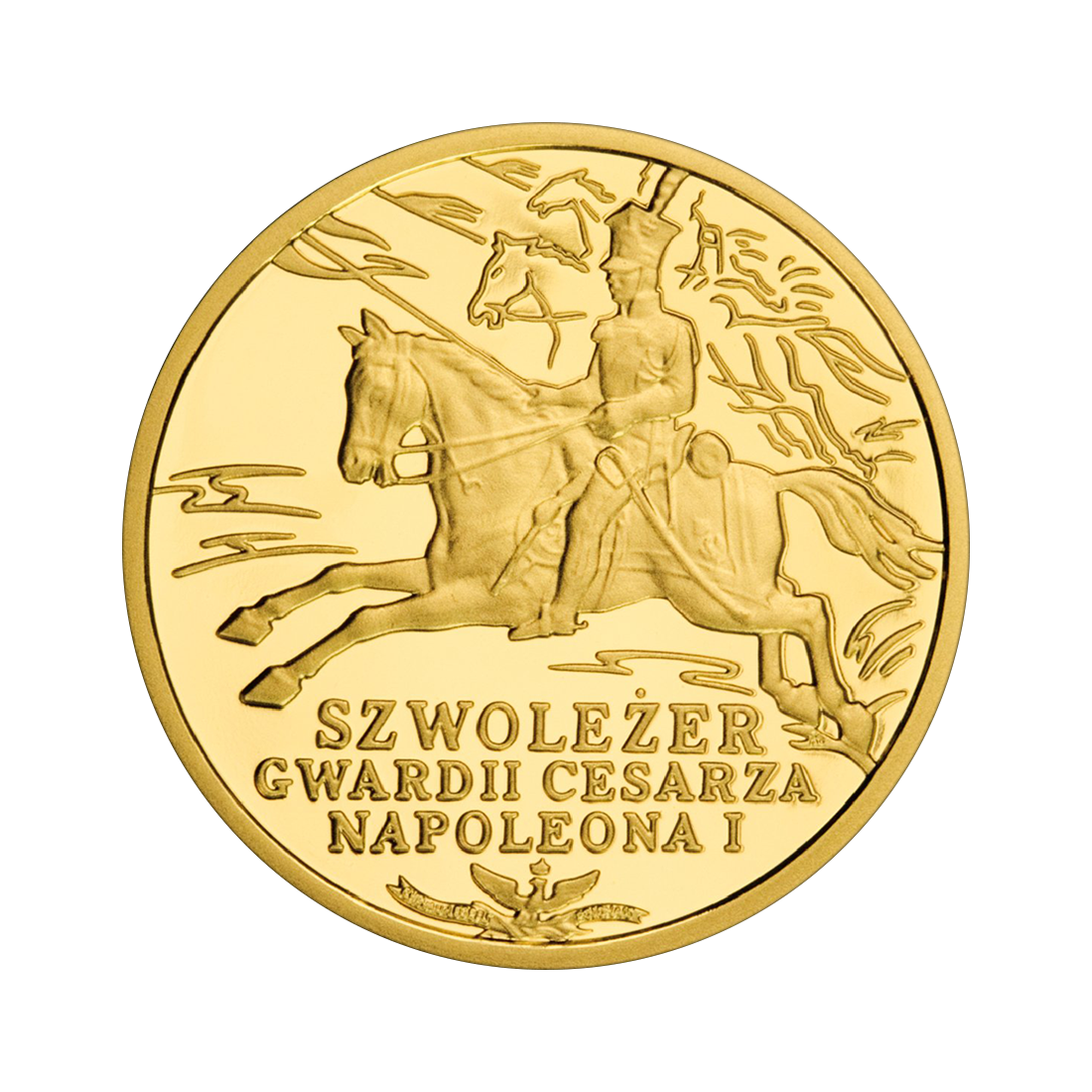 The coin's design clearly refers to the historical nature of the issue, combining precision of execution with clarity of message and attention to detail. The reverse depicts the silhouette of a cavalryman of Napoleon I's Imperial Guard on horseback, in full uniform. The figure is shown in motion, with his saber raised, reflecting the combative nature and courage of these elite cavalry formations. The background remains subdued, which further emphasizes the central motif and gives the scene clarity. Below the figure is an inscription referring to the historical formation. The obverse shows a crowned eagle – the emblem of the Republic of Poland – placed in the upper part of the composition. Next to it is the denomination and the year of issue. Particular attention is drawn to the weapons, uniforms, and decorations of the light cavalryman. These elements emphasize the military character of the coin and enrich its historical narrative. The whole is complemented by the semicircular inscription RZECZPOSPOLITA POLSKA (Republic of Poland), which gives the design an official and representative tone.