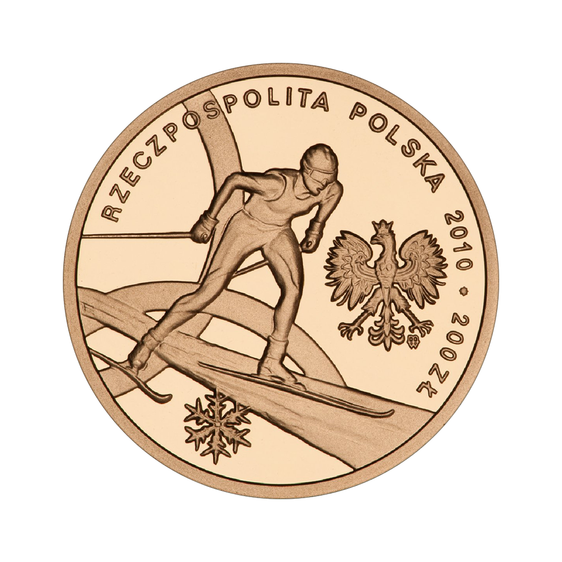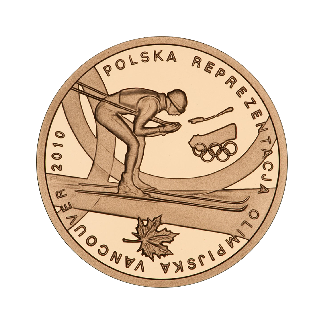The graphic composition of the coin directly refers to the winter theme and the spirit of sporting competition. The whole is kept in the style characteristic of Olympic issues – with an emphasis on the symbolism of movement, national identification, and moderate decorativeness. On the reverse, in the central part, there is a figure of a cross-country skier in motion, reflecting the tension and effort of sporting competition. Below is a maple leaf, which clearly refers to Canada, the host country of the Games. On the right, in the upper part, there is a simplified logo of the Polish Olympic Committee, while along the rim there is an inscription: POLISH OLYMPIC TEAM VANCOUVER 2010. The obverse also features the silhouette of a skier, giving the coin a consistent, two-sided composition. There is also a snowflake, which emphasizes the winter context of the event. In addition, there is also the emblem, the inscription RZECZPOSPOLITA POLSKA (Republic of Poland), the year of issue, and the denomination.