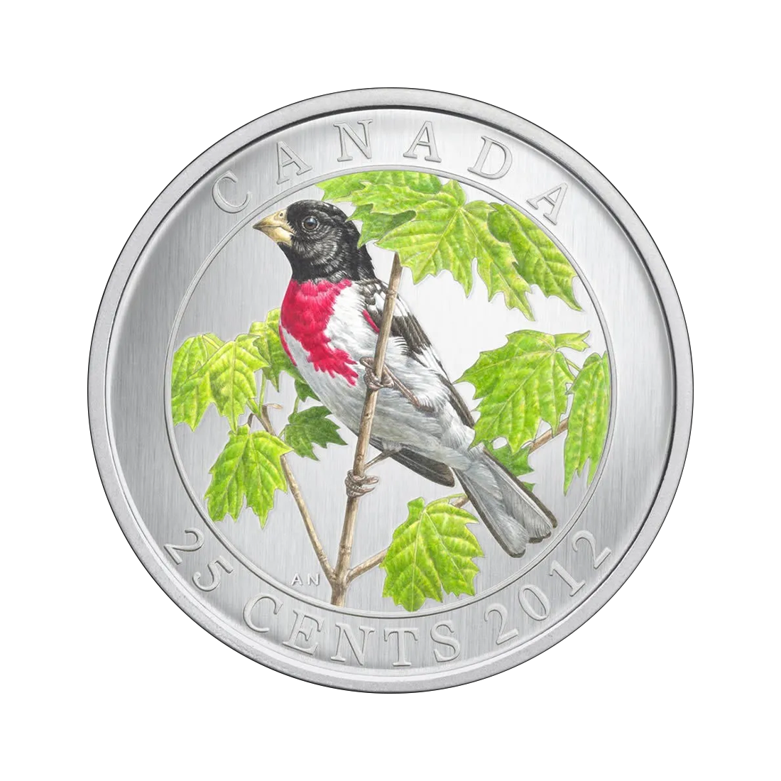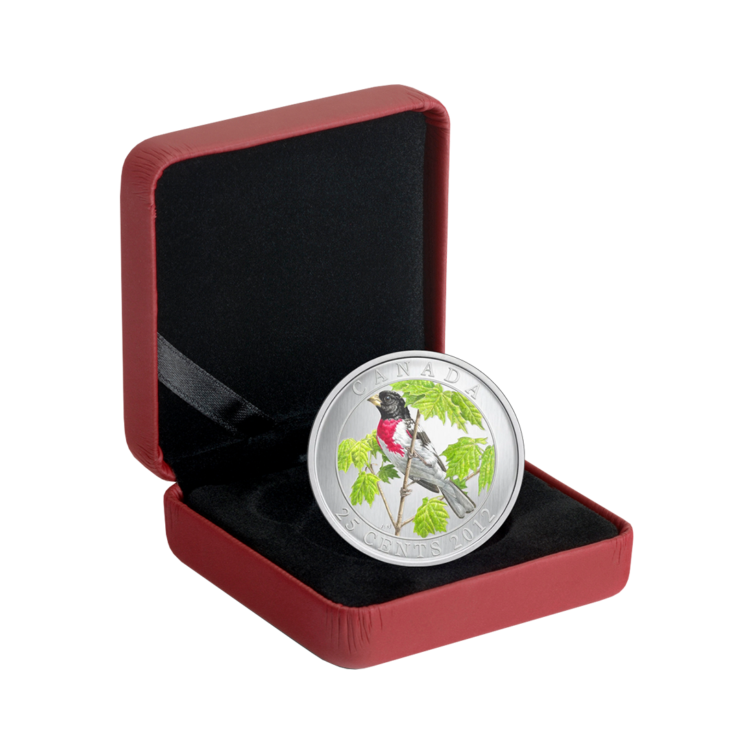 This colorful, engraved coin features a male rose-breasted grosbeak delicately perched on a maple branch on the reverse. It has beautiful coloring, a black head, brown feathers on its wings, and a red and white belly. Looking at the image, one might get the impression that the bird is posing for a photo.