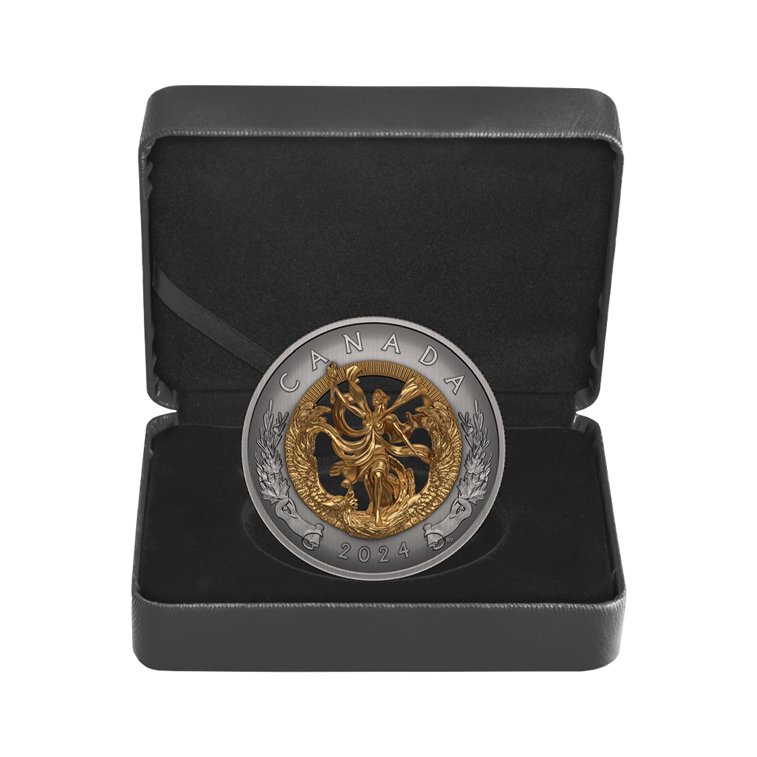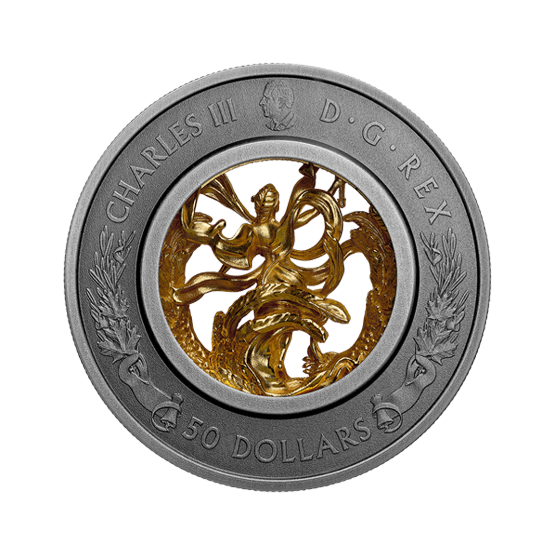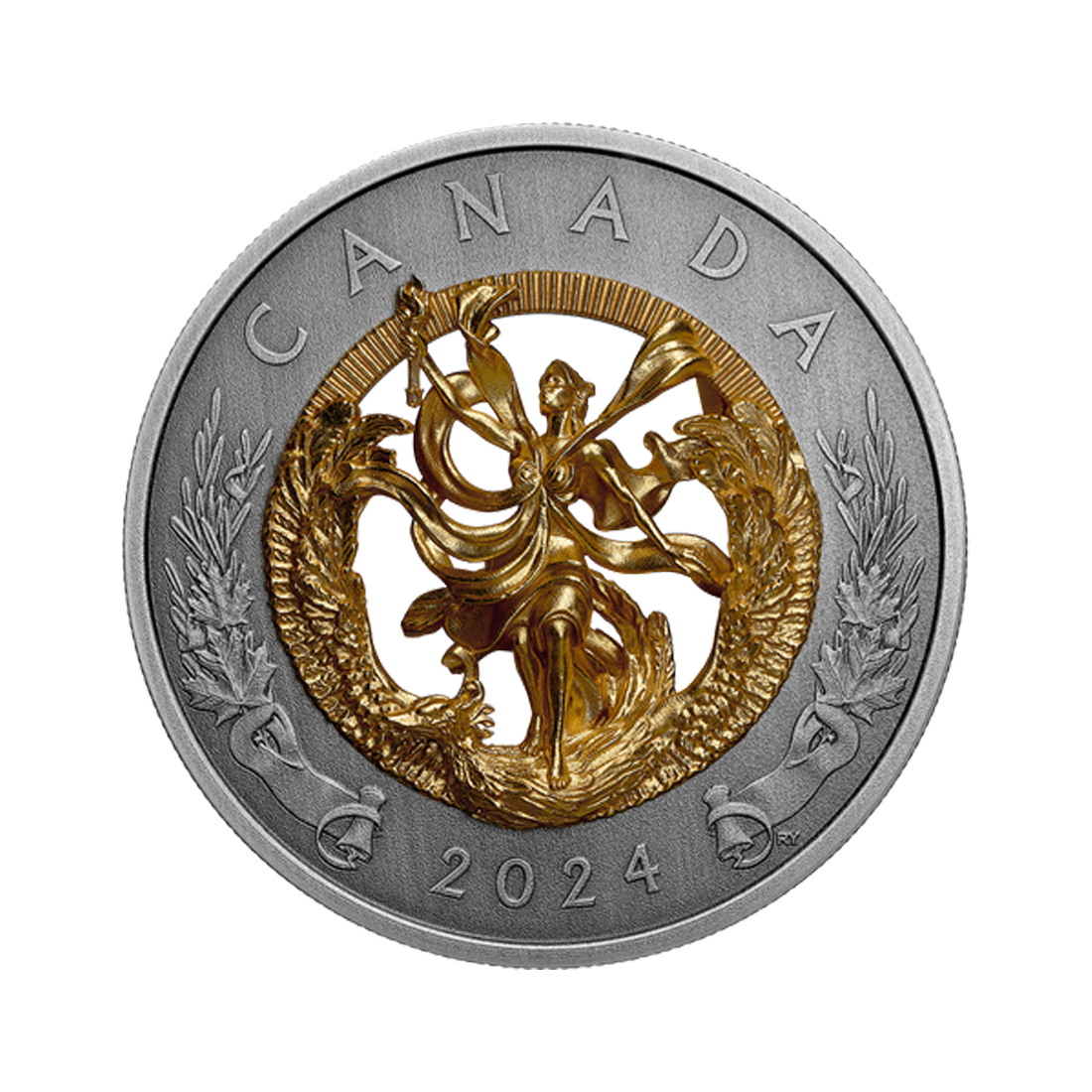 The silver coin features a double-sided 3D figure cast entirely from 99.99% pure silver in its center. It depicts the figure of Liberty, a woman sitting on a mythical bird shown in flight. She holds a torch in her hand, lighting the way. Visible on both the obverse and reverse of the coin, it is gold-plated and symbolizes hope, guidance, and optimism. The obverse features an image of King Charles III by Steven Rosati. In addition, both sides of the coin are decorated with scrolls of parchment, olive branches, and maple leaves on the outer edge, symbolizing Canada's contribution to world peace and freedom. Rebeka Yanovskaya is responsible for the coin's design.