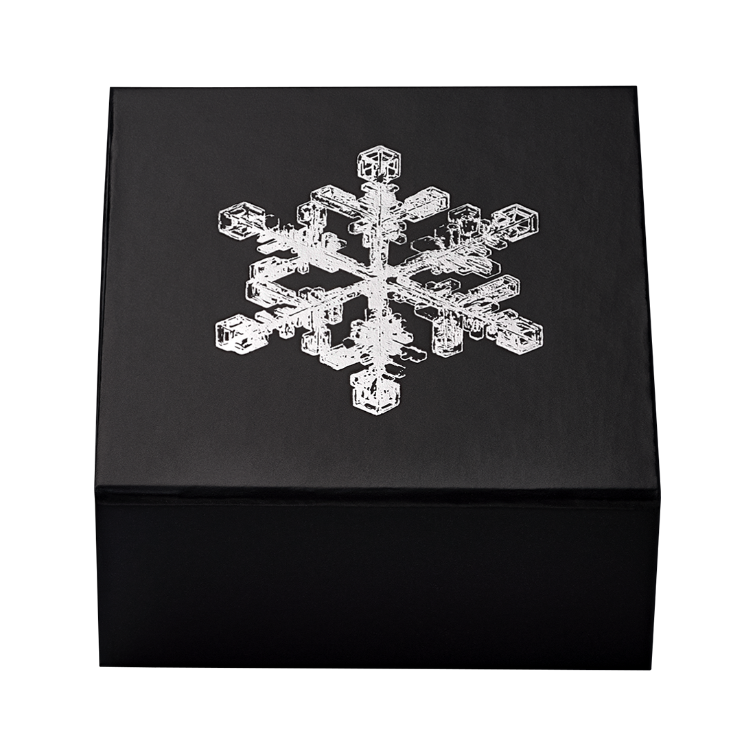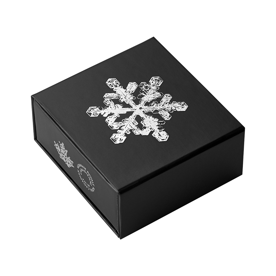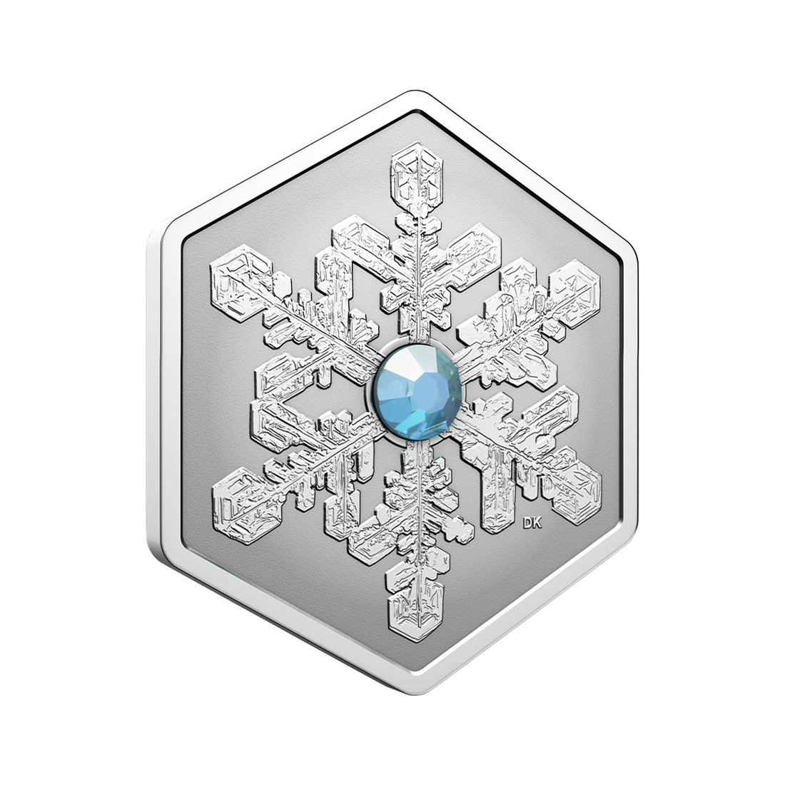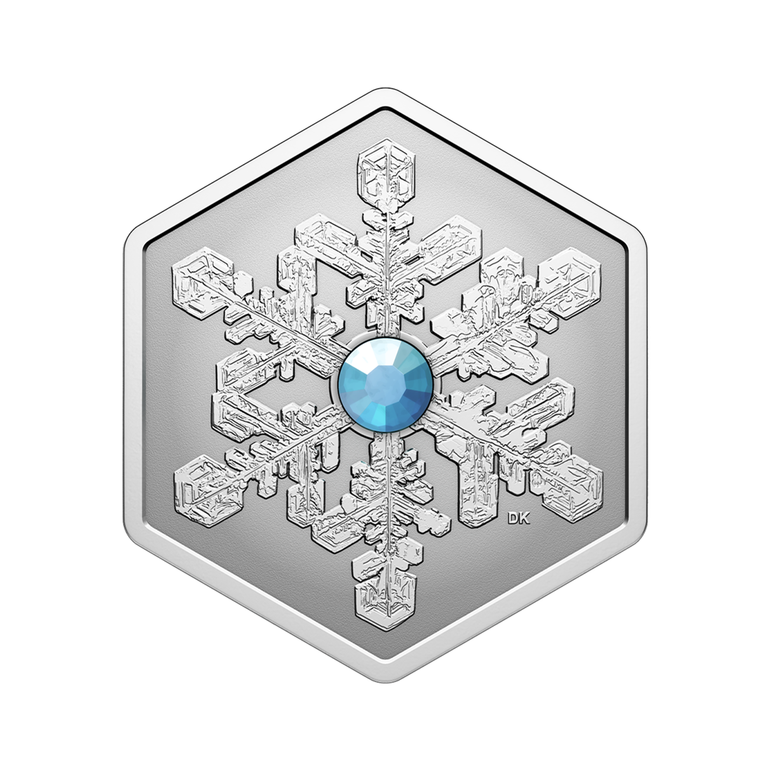 A hexagonal coin made of pure silver, depicting a crystal snowflake. It is an intricately engraved design, inspired by the classic crystal of star-shaped snow dendrites. At the center of the coin is a light blue crystal, reminiscent of the sparkle of freshly fallen snow. The coin weighs 1 ounce, has a mintage of 7,500 pieces, and comes in a sealed display box with a certificate of authenticity. This is the second coin in the Snowflake series.