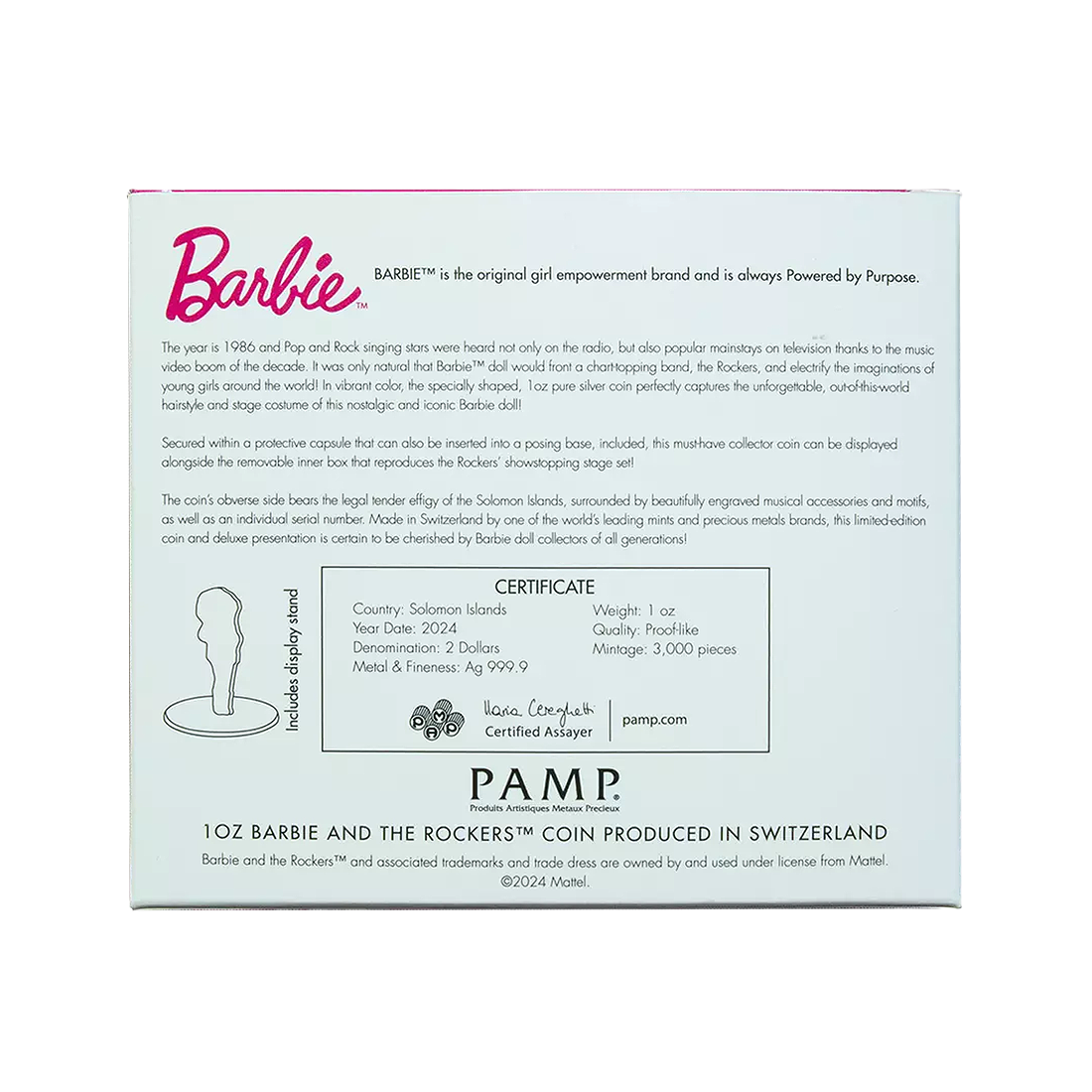 The coin celebrates Barbie's legacy as a global icon of style and pop culture, as well as the numismatic skills of the Solomon Islands. It was issued in 2024, at a time when Barbie was experiencing another renaissance in popularity. It is a tribute to the fashion, music, and artistic expression of that era. Its design is a harmonious combination of Barbie's history and the highest quality of contemporary collector coins.