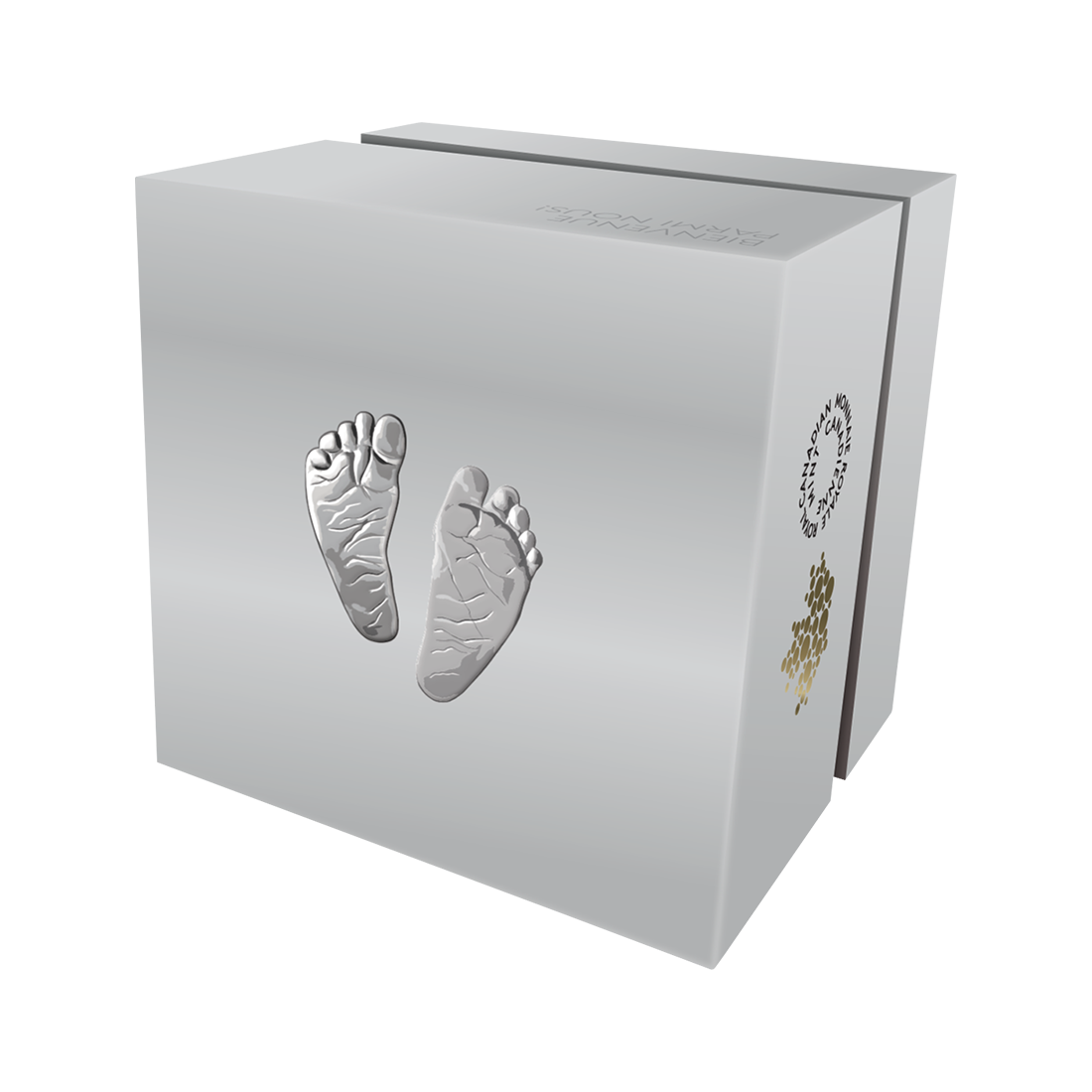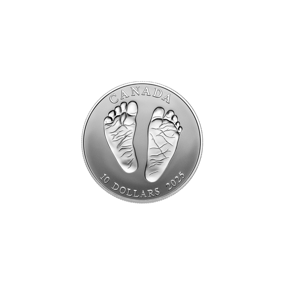 The reverse features tiny baby feet. While most coins have a convex relief, this one has been minted with incisions, adding unique depth and detail. Like tiny footprints in the sand, this feature commemorates precious moments. The word "Canada" is prominently displayed at the top of the coin.