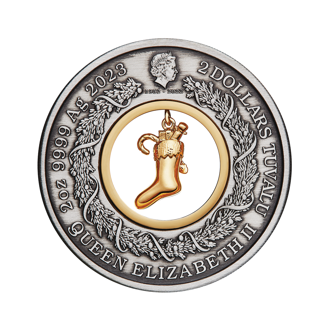 The 2023 coin is a unique numismatic item minted from 2 ounces of pure silver by The Perth Mint. It features an original ring shape with a 24-karat gold-plated Christmas stocking pendant in the center. Around it, on the surrounding ring, there is a Christmas tree, a wreath, garlands, snow globes, wrapped gifts, and other Christmas motifs. The antique finish of the design with colorful decorations adds additional charm. The coin is legal tender in Tuvalu and has a face value of $2. The total mintage is limited to 3,000 pieces, and each coin comes in an elegant Christmas case with a numbered certificate of authenticity.