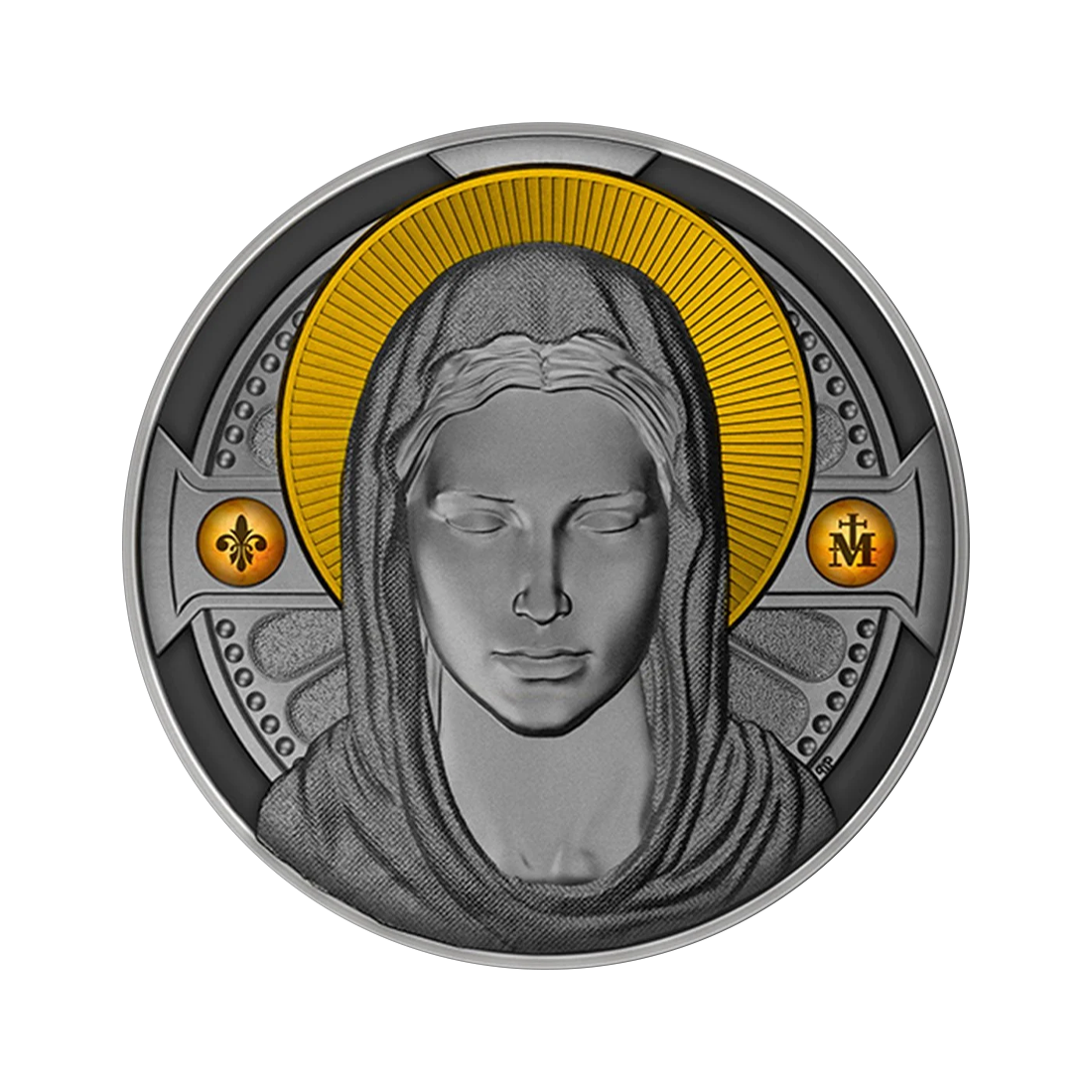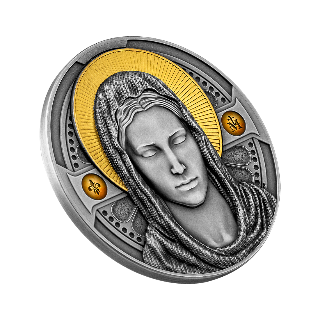 The item is part of a tradition of religious-themed numismatic issues, which are very popular among collectors and investors. The inspiration for this issue was the deeply rooted Christian veneration of the Virgin Mary, especially her iconographic representations in various religious traditions. The Marian motif has been used in art and numismatics for centuries, and this particular coin continues that tradition, combining classic elements with modern minting techniques such as high relief, selective gilding, and the incorporation of natural amber.