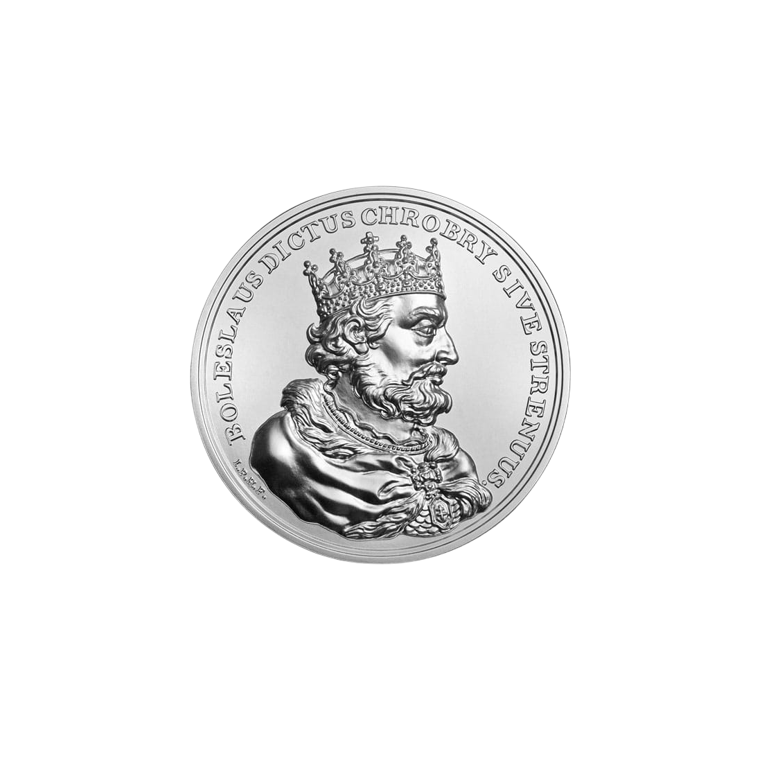 The reverse of the coin features a stylized bust of Bolesław Chrobry, shown in profile in royal attire: a crown, armor, and a cloak fastened with a decorative buckle. The patriarchal cross placed on his chest emphasizes the symbolism of the ruler's Christian heritage. The Latin inscription "BOLESLAUS DICTUS CHROBRY SIVE STRENUUS" is placed on the edge, reflecting the spirit of the times and the way in which the king is commemorated. The obverse features the emblem of the Republic of Poland – an eagle – along with decorative inscriptions and information about the date of issue.