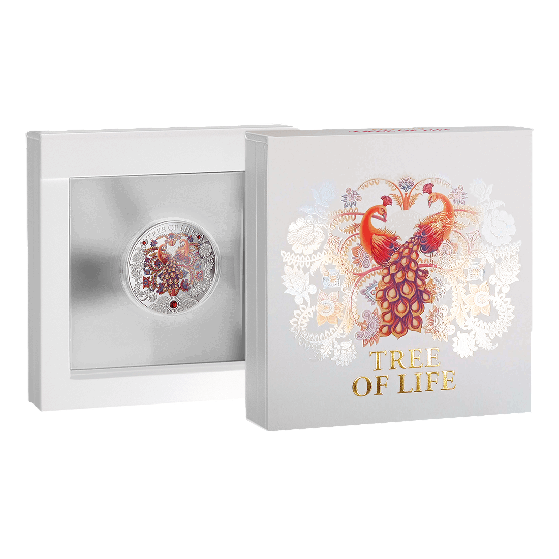 The design by MINT XXI delights with its artistic combination of two peacocks intertwined with a tree crown, whose branches and leaves take on the warm colors of autumn – oranges, purples, and reds highlighted by advanced digital printing technology. A crystal addition incorporated into the tree motif enhances the visual effect and prestige of the coin. The symbolism of the tree of life is based on the idea of rebirth, longevity, and harmony between the world of earth, sky, and spiritual life.