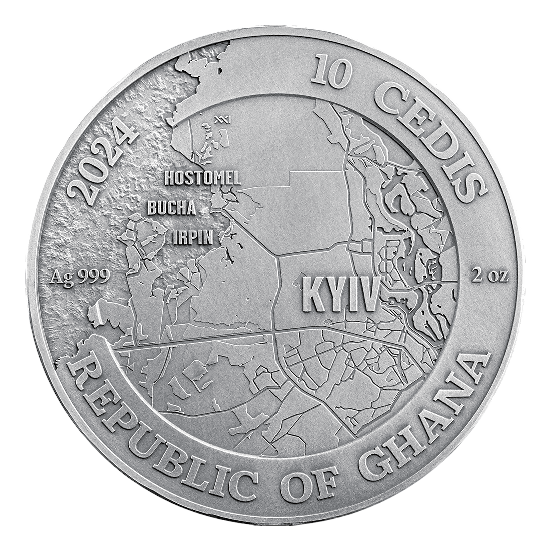 The "Battle of Kiev 2024" coin is a prestigious numismatic item weighing 2 ounces (62.2 g) of pure 0.999 silver, minted by Mint XXI with an antiqued finish and high relief, available with a face value of 10 cedis (Ghana) – a unique proposition for both investors and collectors.