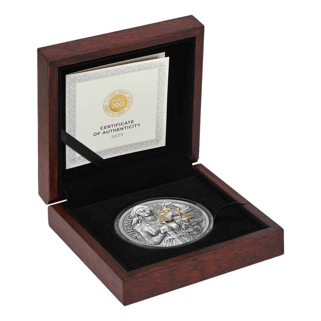 The coin is minted from 0.999 (99.9%) silver using the high relief technique. The antique finish gives it a classic style, while selective gilding highlights the scales and sword elements. The coin is presented in an elegant case with a certificate of authenticity, which enhances its prestige and guarantees the originality of the issue.