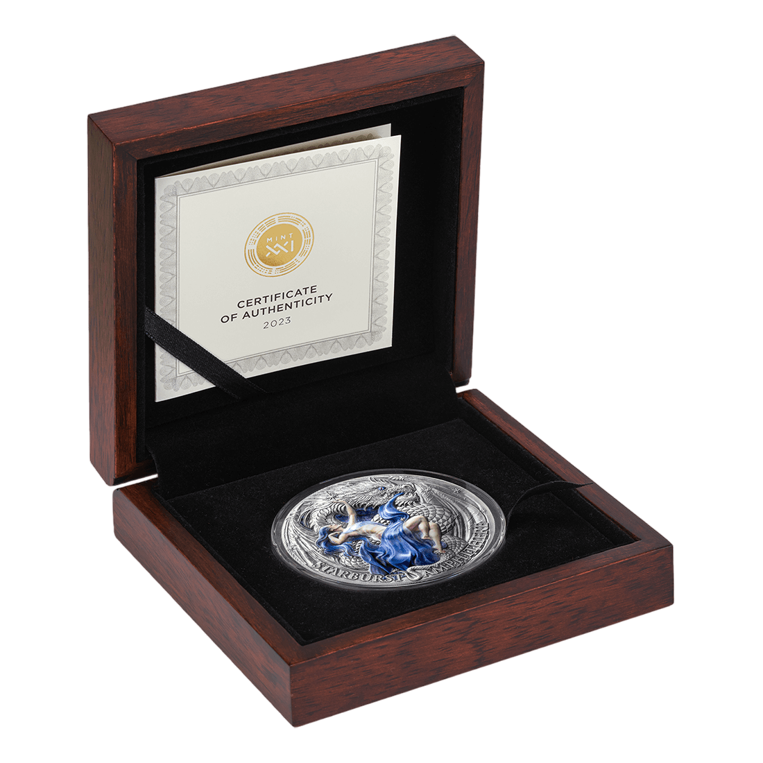 The coin was minted by Mint XXI, a renowned European mint specializing in limited edition, artistic coins with high relief and digital coloring. Each piece comes from an authorized issue, has an individual number in the edition, and a certificate of authenticity (COA). The set includes elegant presentation packaging – a wooden box, a protective capsule, and a certificate. It is an ideal proposition for investors who value certainty of origin and high quality workmanship.