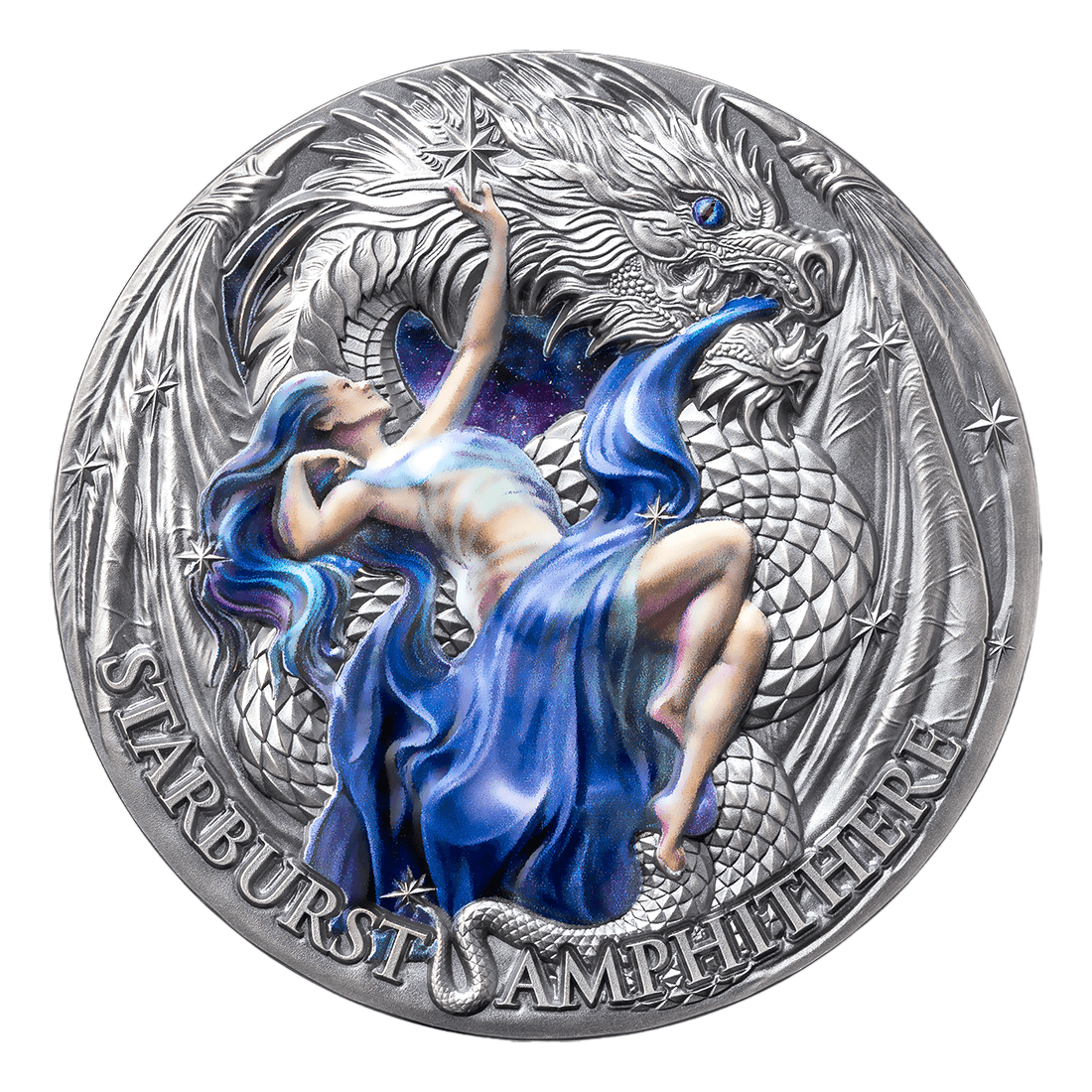 The artistic narrative of the coin reflects the mystical nature of the Starburst Amphithere dragon, symbolizing wisdom, strength, and protection of treasures. The dragon's eye attracts attention and is the focal point of the composition. The design features a delicate nymph surrounded by a starry rain, a metaphor for the harmony between fantasy and reality. The high relief created by Mint XXI emphasizes the meticulousness of the details: scales, wings, starry background – all executed with care. Digital color and antique patina give each coin a unique appearance that immediately stands out from other coins.