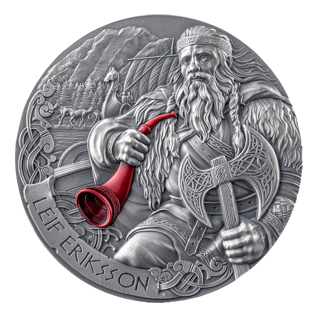 The coin's design was created with extraordinary attention to detail. The High Relief minting technique combined with the Antique Finish gives it exceptional depth and nobility. The reverse depicts Leif Eriksson standing on the bow of a ship, with an axe in one hand and a war horn in the other. The dynamic composition and color contrast – including the intense red of the horn – attract attention and emphasize the drama of the scene. The obverse of the coin features a stylized image of a Norse warrior and inscriptions indicating the denomination, the name of the issuer, and the year of issue.