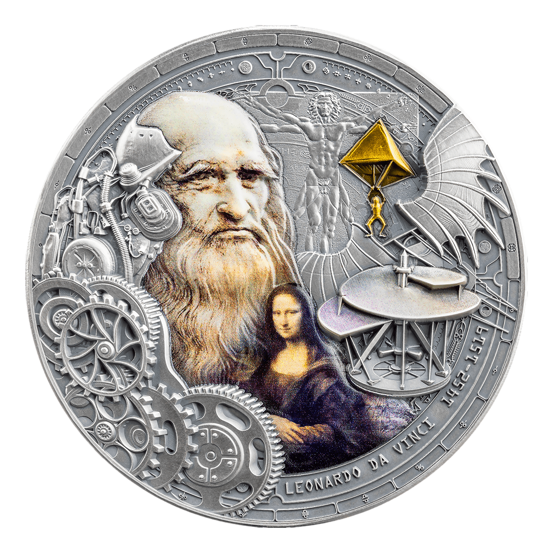 The reverse side of the coin features Leonardo da Vinci's most iconic works, including the famous Mona Lisa, Vitruvian Man, and diagrams of flying machines such as an air propeller, parachute, and wings inspired by bird anatomy. Each element has been reproduced with extraordinary precision, and thanks to the use of selective gilding and digital printing, the coin gains a depth and clarity unmatched by standard issues.