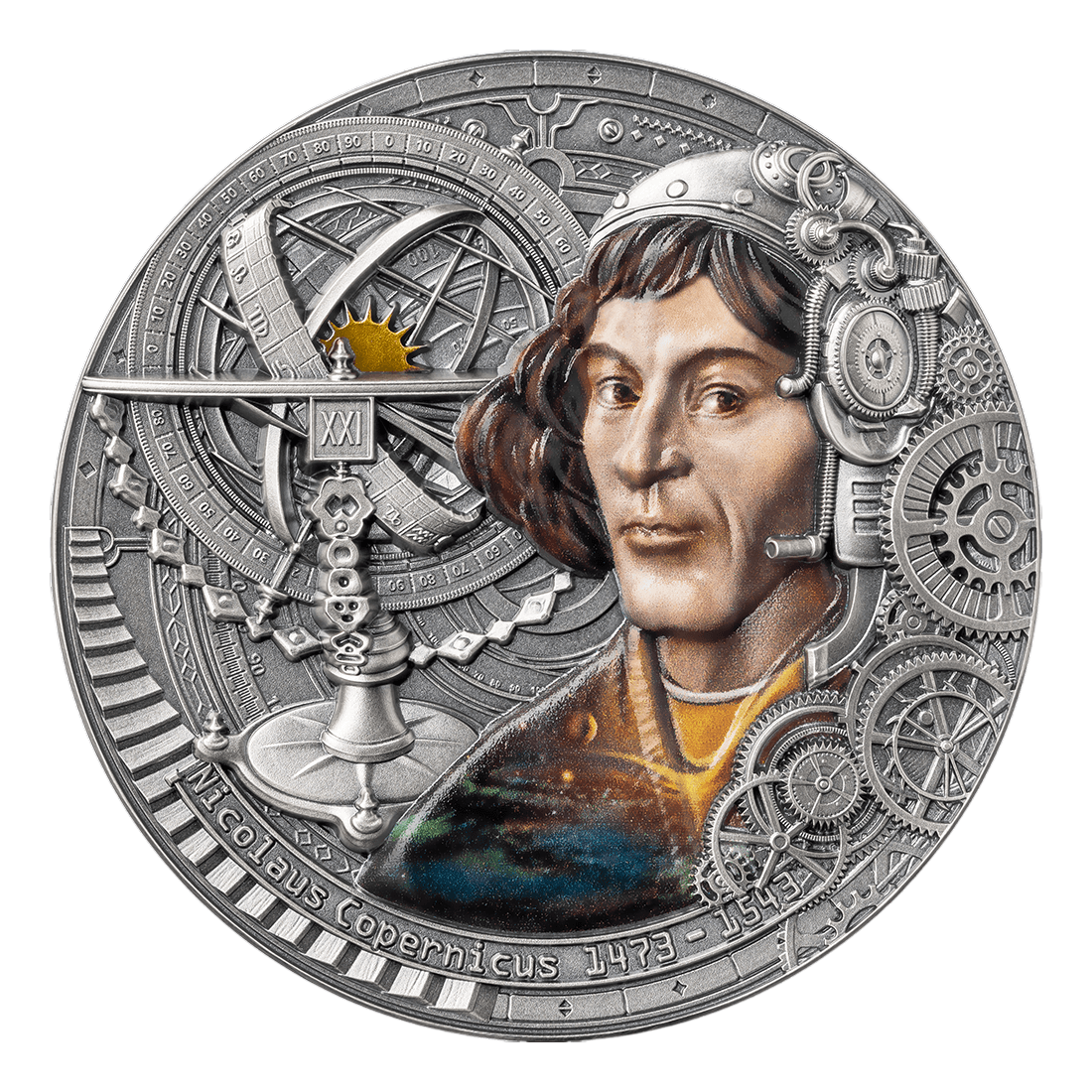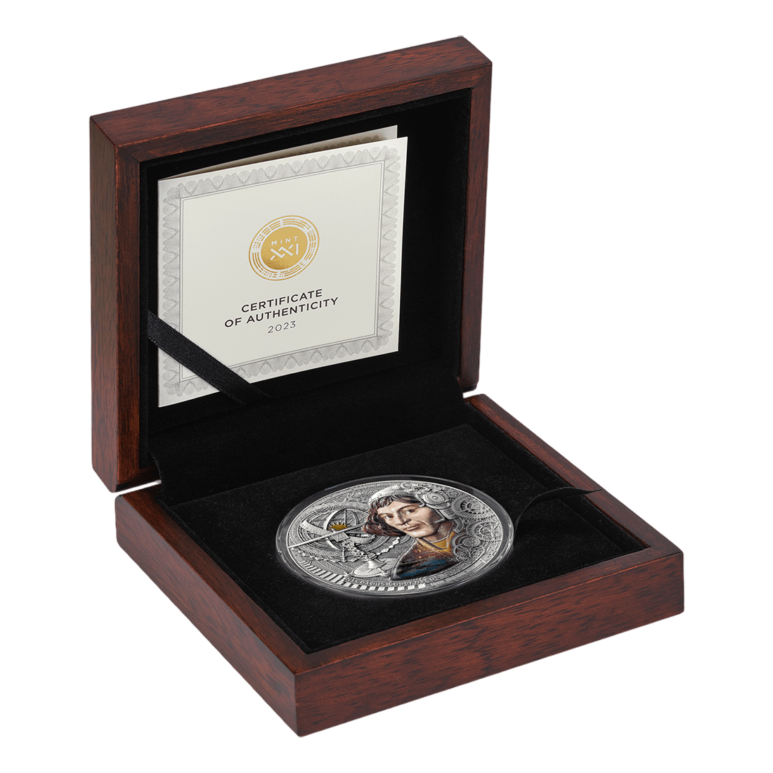 The 2023 Futurists of the Past: Nicolaus Copernicus silver coin is a unique two-ounce (62.2 g) issue dedicated to the 550th anniversary of the birth of one of the most outstanding scholars in history. Made of the highest quality Ag 999 silver, using high relief technology, it presents an extraordinary level of detail and craftsmanship. With a limited mintage of only 500 pieces, it is not only a collector's item, but also an investment with the potential to increase in value over time.