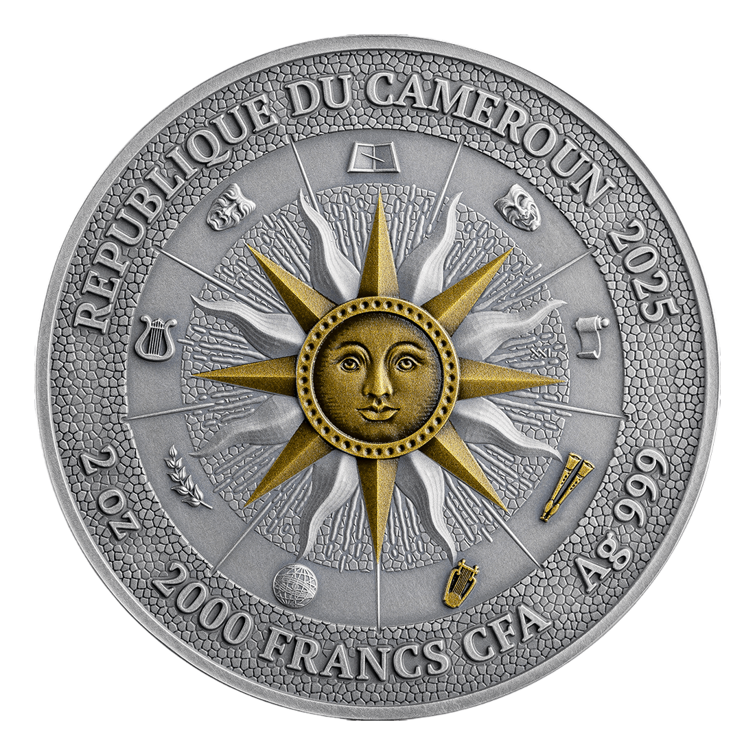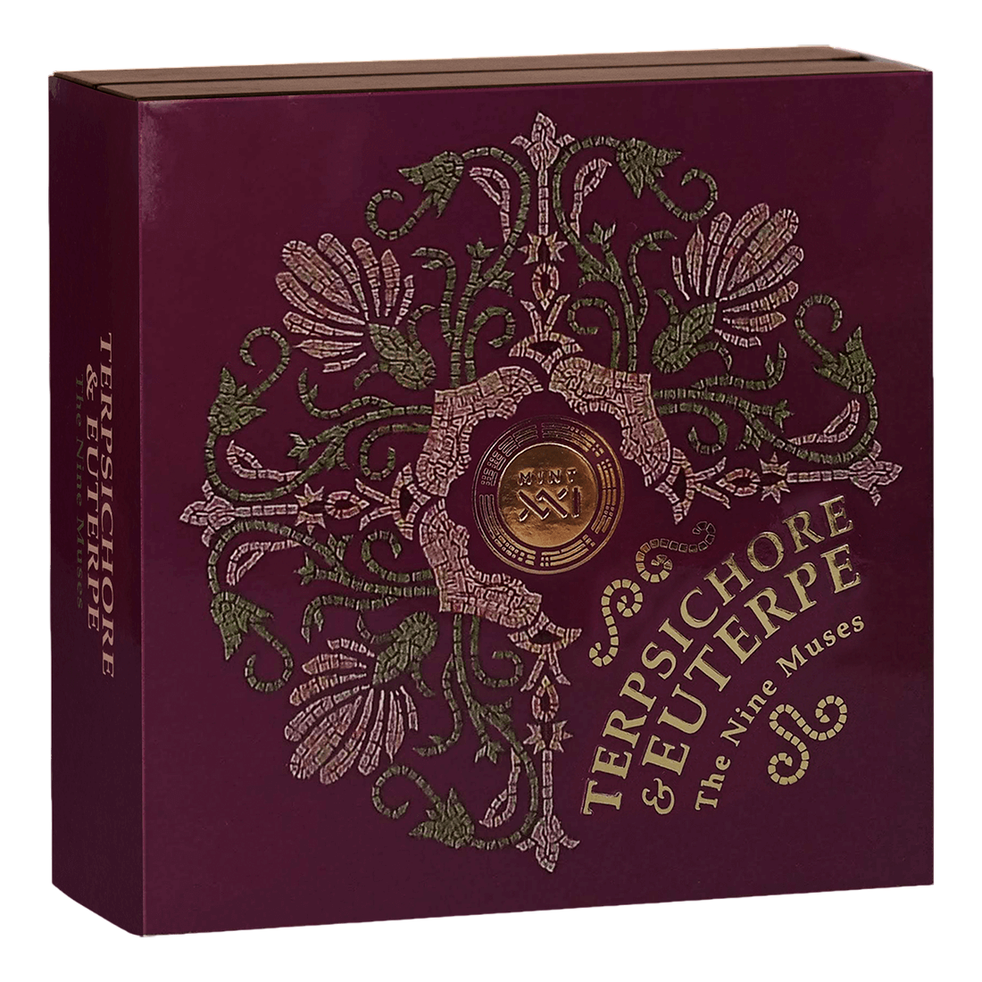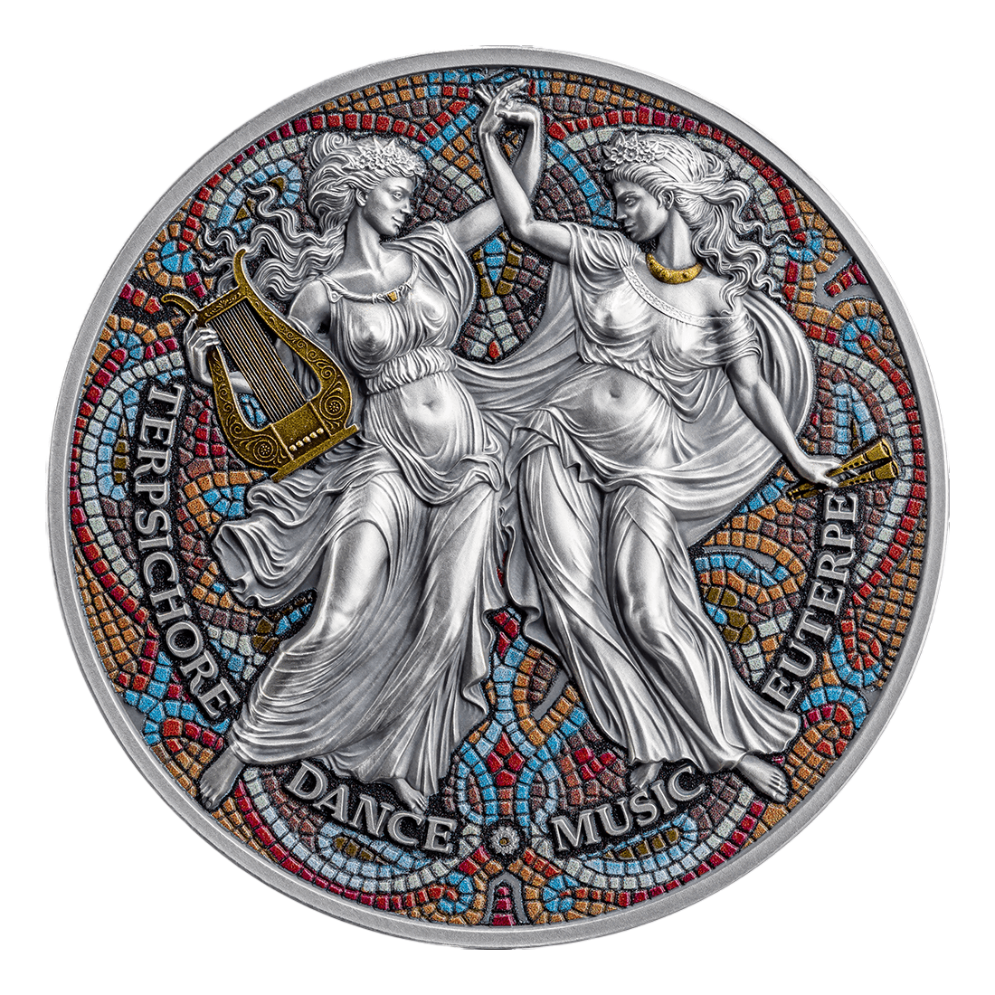 The coin has been minted in antique high relief, which emphasizes the spatiality of the details and gives the whole an impressive depth. The reverse depicts Terpsichore and Euterpe surrounded by stylized mosaics, enriched with digital printing and gilding elements, which further accentuate the elegance and historical atmosphere. The obverse shows a symbolic wheel divided into nine segments, dedicated to each of the muses, with a gilded sun at the center.