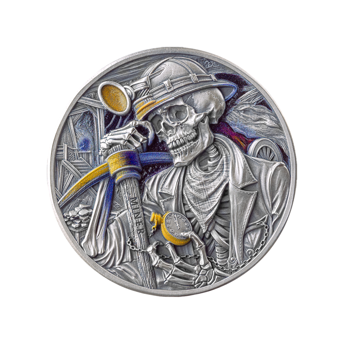 The coin's theme – a skeleton miner with a pocket watch and a pickaxe – is an artistic interpretation of the idea of memento mori. The composition reminds us of the fragility of life and the inevitability of time, while paying tribute to hard physical labor. Such symbolism gives the coin depth and makes it not only an investment asset, but also a carrier of a universal message.