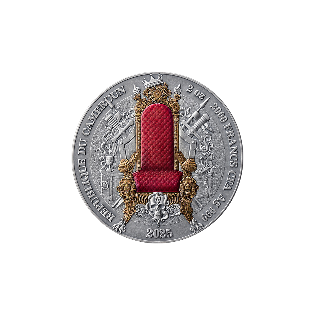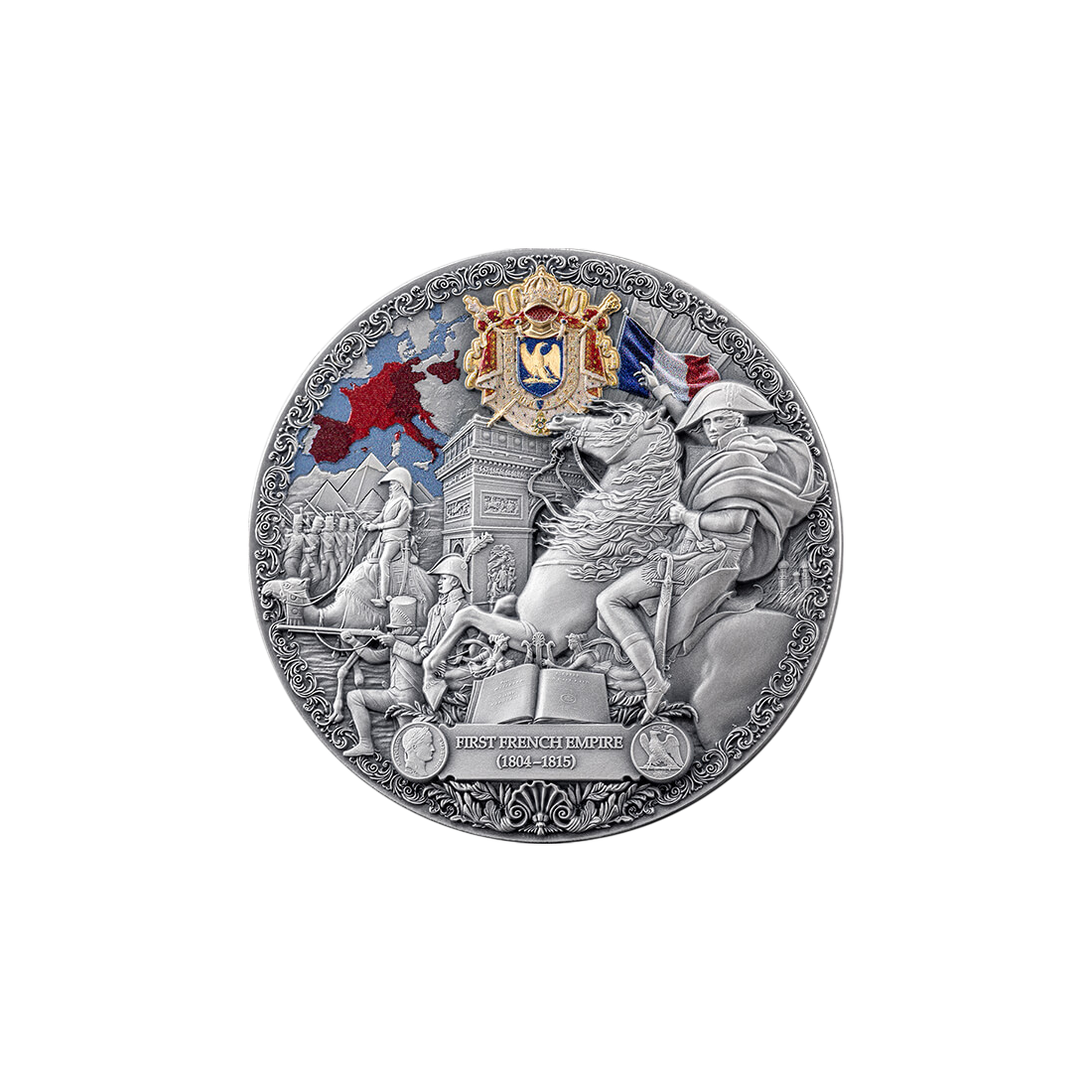 The obverse of the coin is a true masterpiece of craftsmanship. It features the emblem of the Republic of Cameroon, a symbol of the issuer's sovereignty and independence, surrounded by an elegant frame with floral motifs and a symbolic sun, referring to power and majesty. The details are extremely precise, and the antique finish emphasizes the historical character of the coin. The reverse of the coin, in turn, is a visual story of the power of the French Empire. The central part is dominated by the image of Napoleon Bonaparte in his iconic pose, full of dynamism and details that evoke images of great victories and an era of domination. It is a masterpiece of art, where the high relief gives the figure a three-dimensional quality, and details such as the imperial eagle, banners, and crown are rendered with extraordinary care. In addition, selective gilding and digital printing give the coin a unique, modern look, emphasizing its exclusivity.