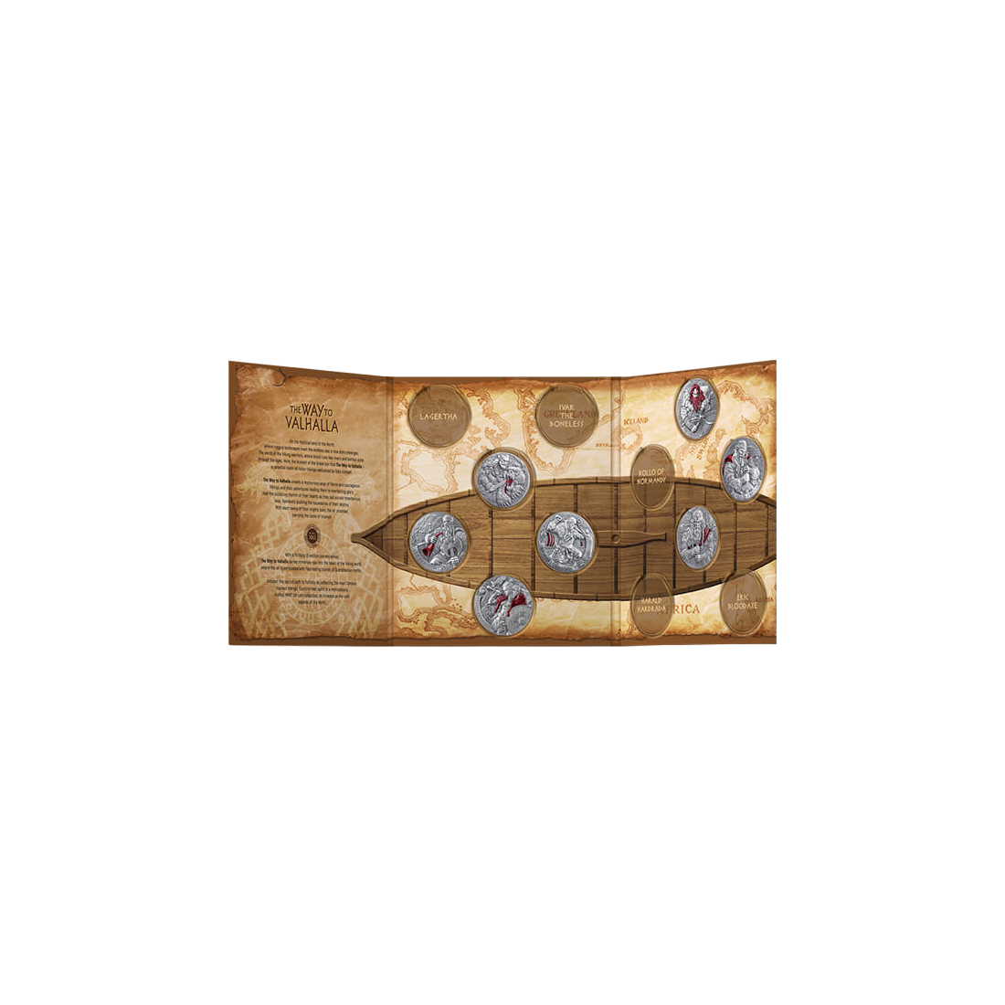The central motif of the coin is the image of Canute the Great, the ruler who created the North Sea Empire in the early 11th century by uniting Denmark, England, and Norway. His reign symbolizes an era of prosperity, power, and strategic vision. The design on the coin, executed in high relief, reflects the majesty and determination of the ruler. King Canute the Great is depicted wearing a crown, with an expressive, confident face that emphasizes his unwavering strength. The background is a stormy sea, alluding to the famous legend in which Knut commands the waves to retreat to prove to his flatterers that no mortal, not even a king, has power over the forces of nature. Digital printing adds depth and realism to the scene, making every detail, from the folds of the robes to the churning waves, perfectly visible. This historical context gives the coin added value, transforming it from mere metal into a tangible piece of history. This combination of historical narrative and masterful craftsmanship is key to its collectible and investment value.