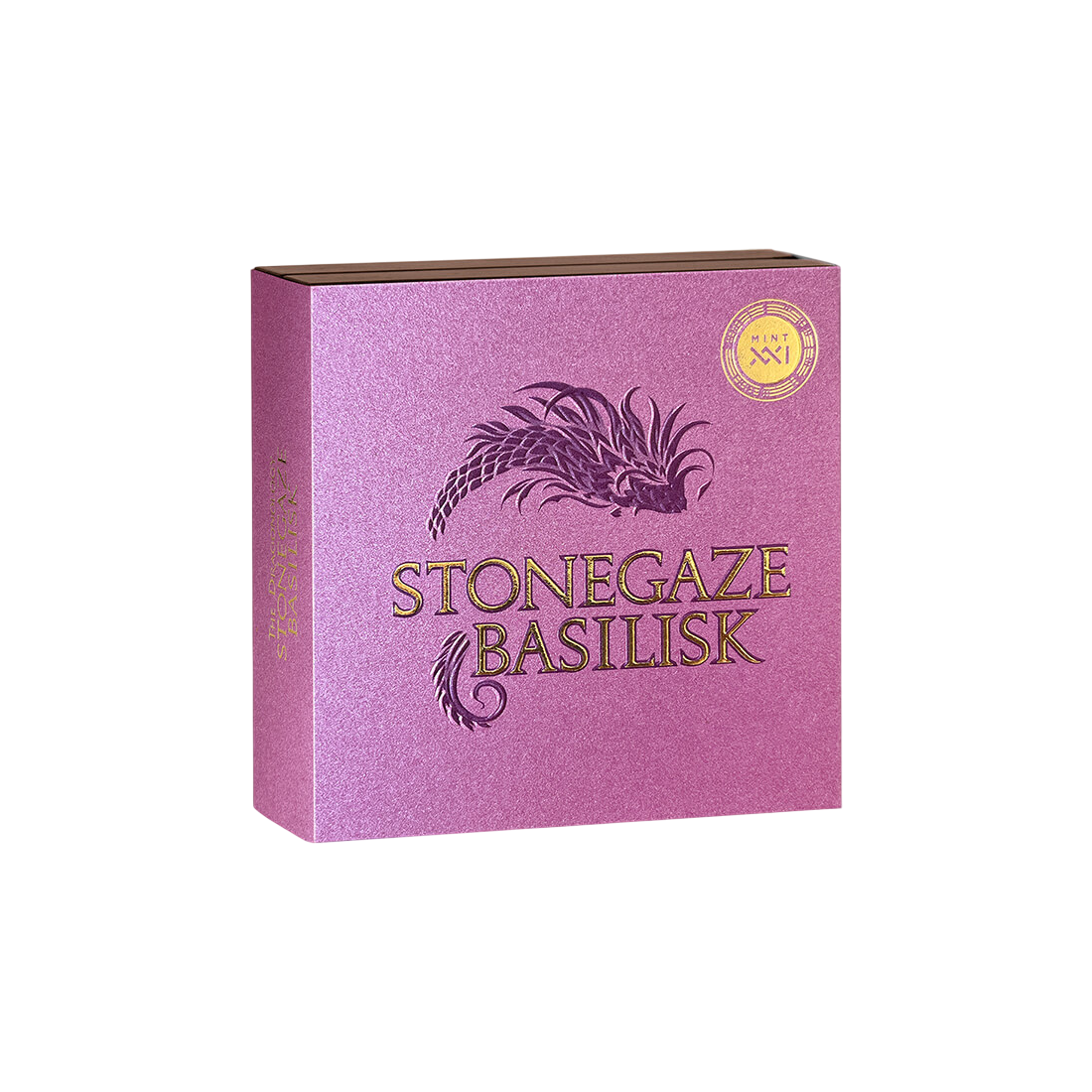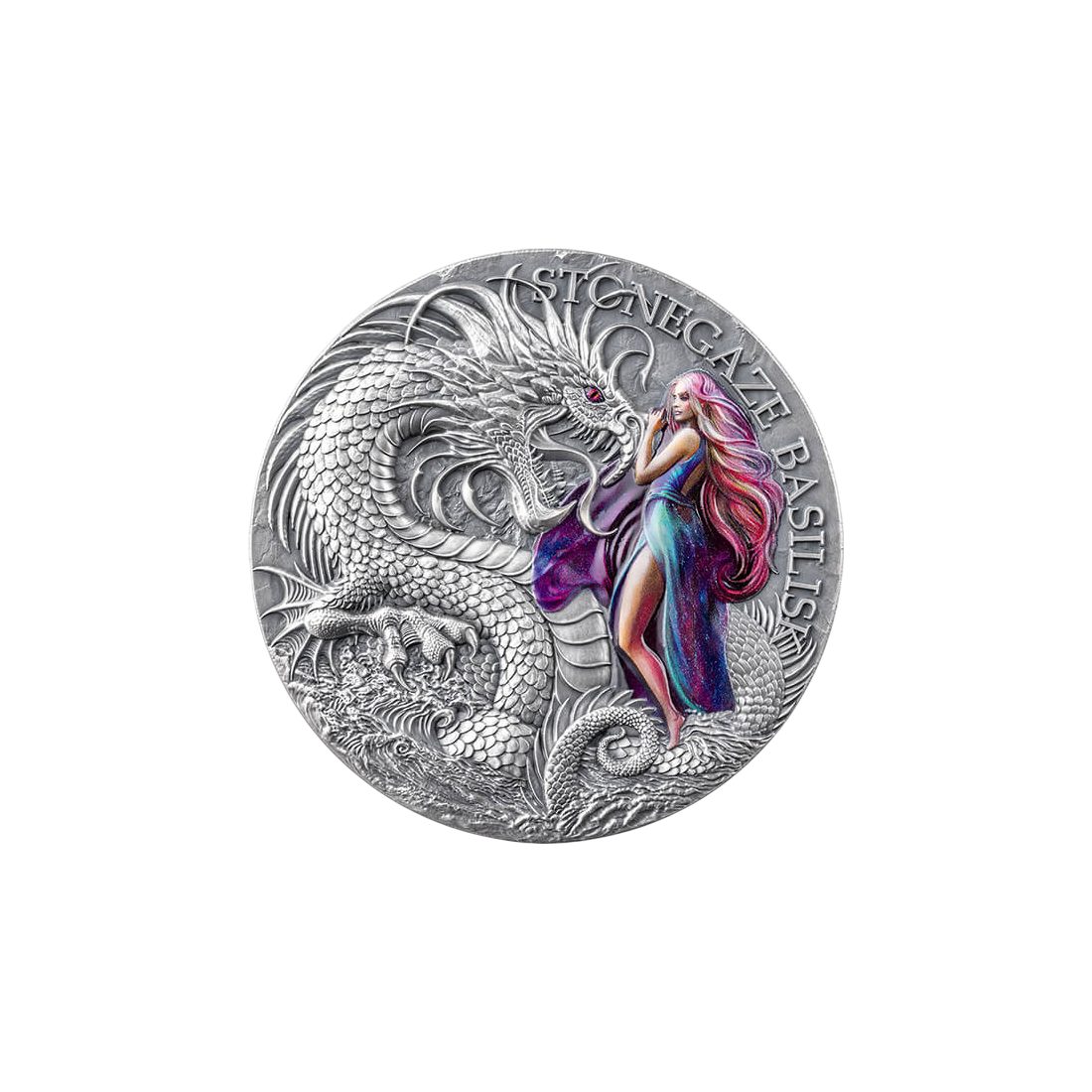 The coin transports you to a world of ancient legends, ruled by the Basilisk – a mythical creature with a deadly gaze. According to legend, its gaze could turn the living to stone, and its breath was equally destructive. On the reverse of this coin, the Basilisk is captured in a dynamic pose, exuding power and strength. The artistic vision shows every scale, claw, and fierce expression of the beast, highlighting the craftsmanship and attention to detail. Next to it, in an act of extraordinary contrast, stands a calm, mysterious woman, symbolizing composure in the face of chaos. This scene is not only a clash of force and peace, but also a reference to cultural symbols that have fascinated humanity for centuries. This coin is a physical manifestation of legend, which increases its collectible value beyond the value of the metal itself.
