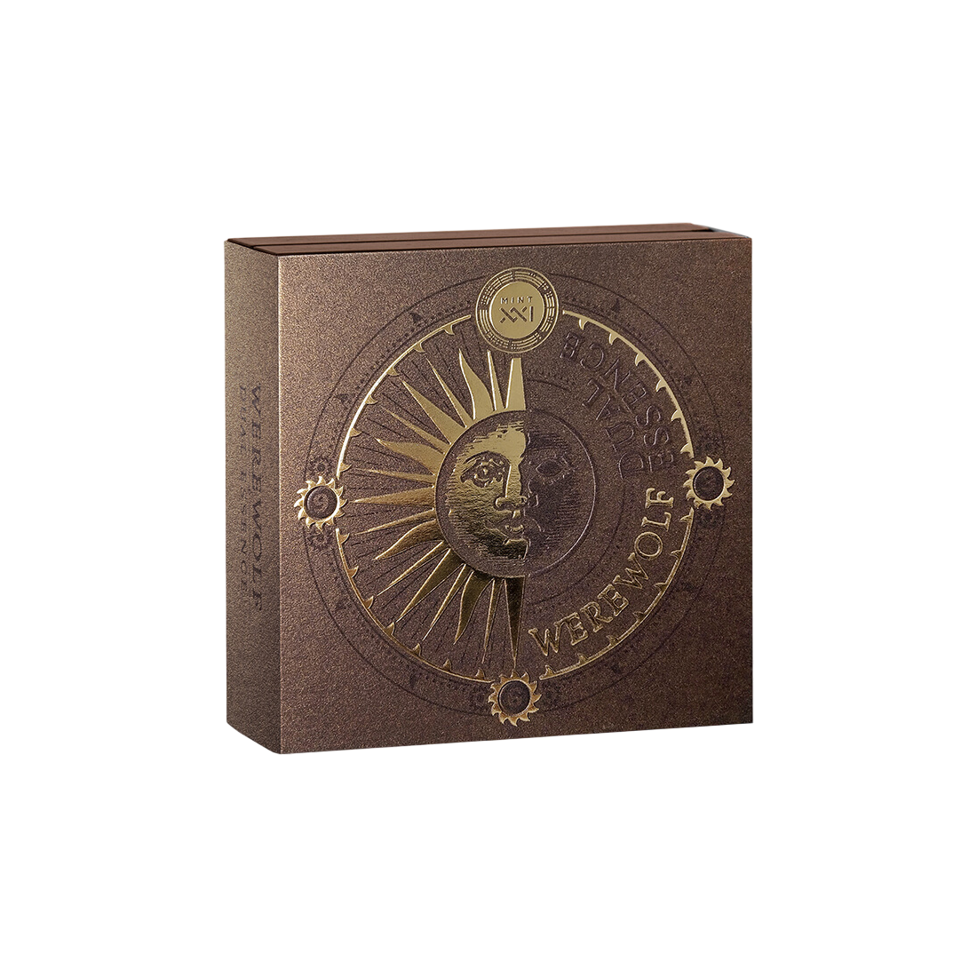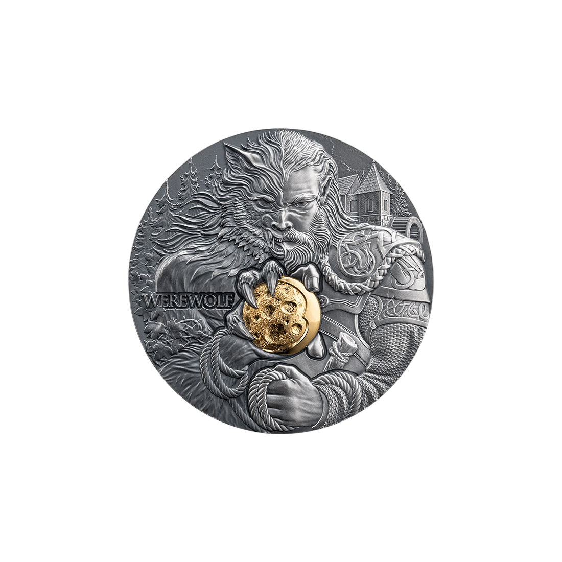 The reverse of the coin celebrates the fascinating and enigmatic mythology of the werewolf, embodying the eternal duality of human nature—a combination of innate intelligence and primal, wolf-like instincts. Masterful high relief technique brings this mythical transformation to life, depicting the powerful figure of the beast at the moment of peak power and transformation. Every detail, from the fur to the taut muscles, has been rendered with extraordinary precision, which is the hallmark of the MINT XXI mint. The sophisticated Antique Finish gives the coin an antique, dark character, enhancing the impression of depth and mystery. The focal point of the composition is the selective gilding that accentuates the moon held by the werewolf. This gilded element shines brightly against the night sky, providing a symbolic contrast and enhancing the coin's aesthetic and collectible value. The Werewolf is a captivating narrative of power and transformation, entirely engraved in precious silver and shrouded in shadow, which will be appreciated by every connoisseur of art and metal.