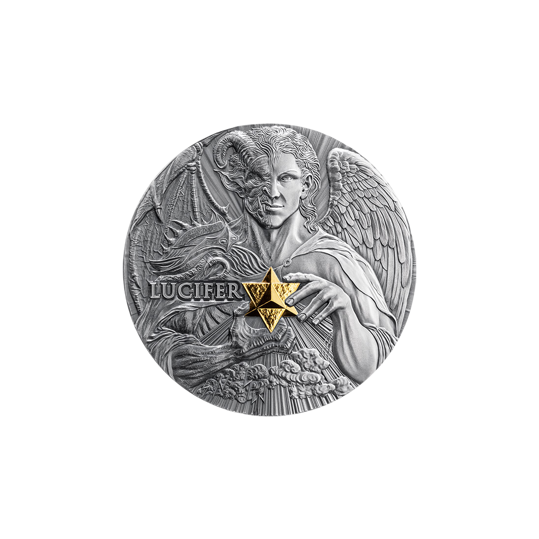 Welcome to the world of numismatic collecting, where art and precious metal meet. The "Duality of Nature: Lucifer" coin is the second issue in the acclaimed *Dual Essence* series, which gained immediate recognition among investors and collectors. This item, symbolizing the profound metamorphosis and duality embodied by Lucifer—from shining cherub to fallen angel—is a unique testament to numismatic craftsmanship. The coin catches the eye with its stunning high relief and selective gilding, which highlights the symbolic Morning Star. Every detail has been carefully crafted to create a work of unparalleled visual depth, finished in Antique Finish quality.
