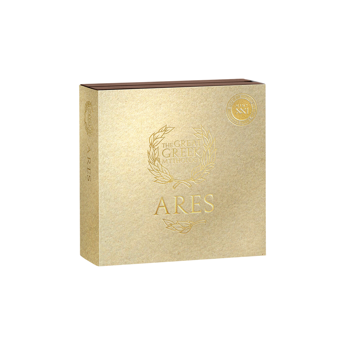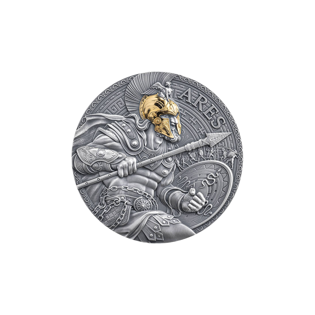 Capture the spirit of war and heroic strength in the 2024 coin, which majestically depicts the Greek god Ares. Minted by the renowned MINT XXI mint, this coin is a numismatic masterpiece, combining pure precious metal and masterful craftsmanship. Particular attention is drawn to the antique finish, which gives the silver a patina of age, and the extremely high relief. This advanced sculpting technique brings out the three-dimensionality of the image, emphasizing every detail of the god's menacing armor and unyielding facial expression, symbolizing his readiness for battle and honor. The selective gilding of the helmets and selected elements of the armor adds an element of royal majesty to the composition and emphasizes its luxurious character. Ares, the god of chaos and battle honor, becomes a metaphor for the steadfastness and investment strength offered by precious metals, embodying the potential that lies dormant in unique numismatic items.