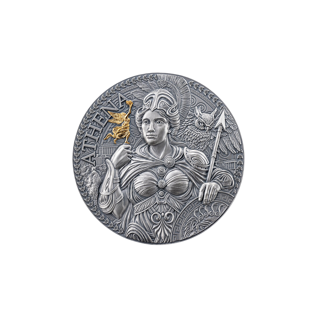 The reverse of the coin depicts the majestic figure of Athena. Her wisdom is symbolized by her owl companion, and her power by her shield. The central point of the composition is the figure of Nike, the goddess of victory, which is subtly highlighted by selective gilding. This gilded detail contrasts beautifully with the antique finish of the entire coin. Thanks to the high relief technology, every detail, from the armor to the intricately crafted helmet, gains a three-dimensional depth that captivates even the most demanding collectors. This is a masterpiece by the MINT XXI mint, confirming its position in the world of numismatic collecting. The 50 mm diameter coin comes in an elegant box with a Certificate of Authenticity, making it a complete and ready-to-store item for your collection.