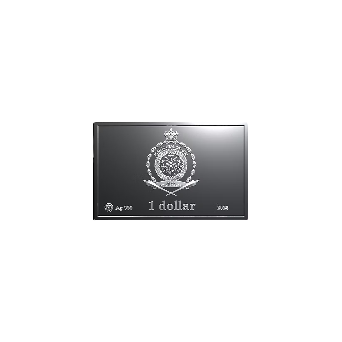 This unique coin has been minted from 999 silver, which is the highest standard of purity valued in investment transactions around the world. One ounce of pure metal (31.1 grams) provides a solid material basis, independent of economic fluctuations. Its shape, a rectangular cutout measuring 47 mm x 30 mm, gives it a modern and original character, distinguishing it from traditional bullion coins. The Prooflike finish ensures an excellent appearance, highlighting every detail of the intricate scene on the reverse. The obverse of the coin features the Niue public emblem and basic identification information essential for investors: the denomination of 1 dollar, the purity of Ag 999, and the year of issue, 2025. It is an investment in rarity, history, and the highest quality of craftsmanship.