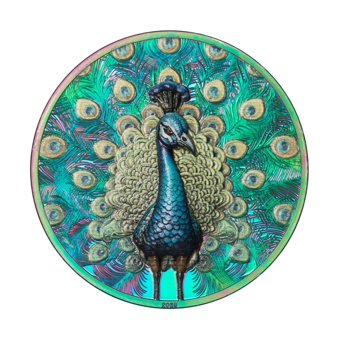 This unique silver coin, part of the prestigious "Spectrum" series, is an excellent choice for investors seeking a combination of pure precious metal and exceptional artistic craftsmanship. The year 2025 brings the Peacock design, symbolizing beauty, royalty, and immortality. The magic of this coin is revealed when the peacock's feathers unfold, creating a blaze of color. Ultra-High Relief meets an innovative coloring technique that gives the Proof finish unique metallic tones. The reflection of light refracts differently on each coin, making each piece shimmer with its own unique glow. This effect guarantees that no two coins in the world are identical, which dramatically increases their collectible and investment potential.
