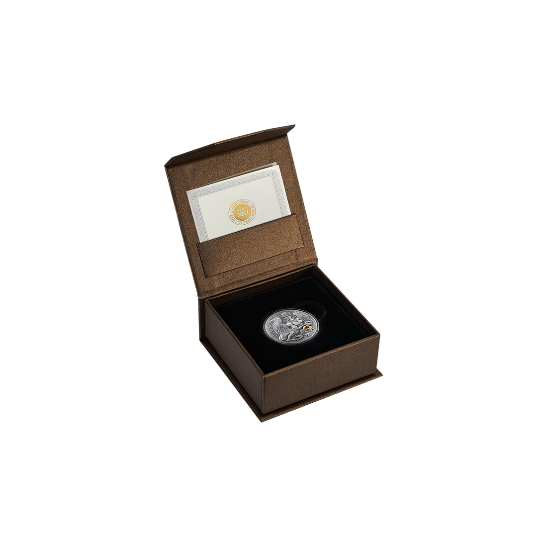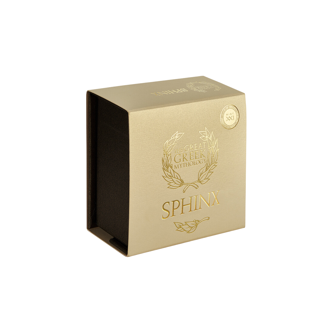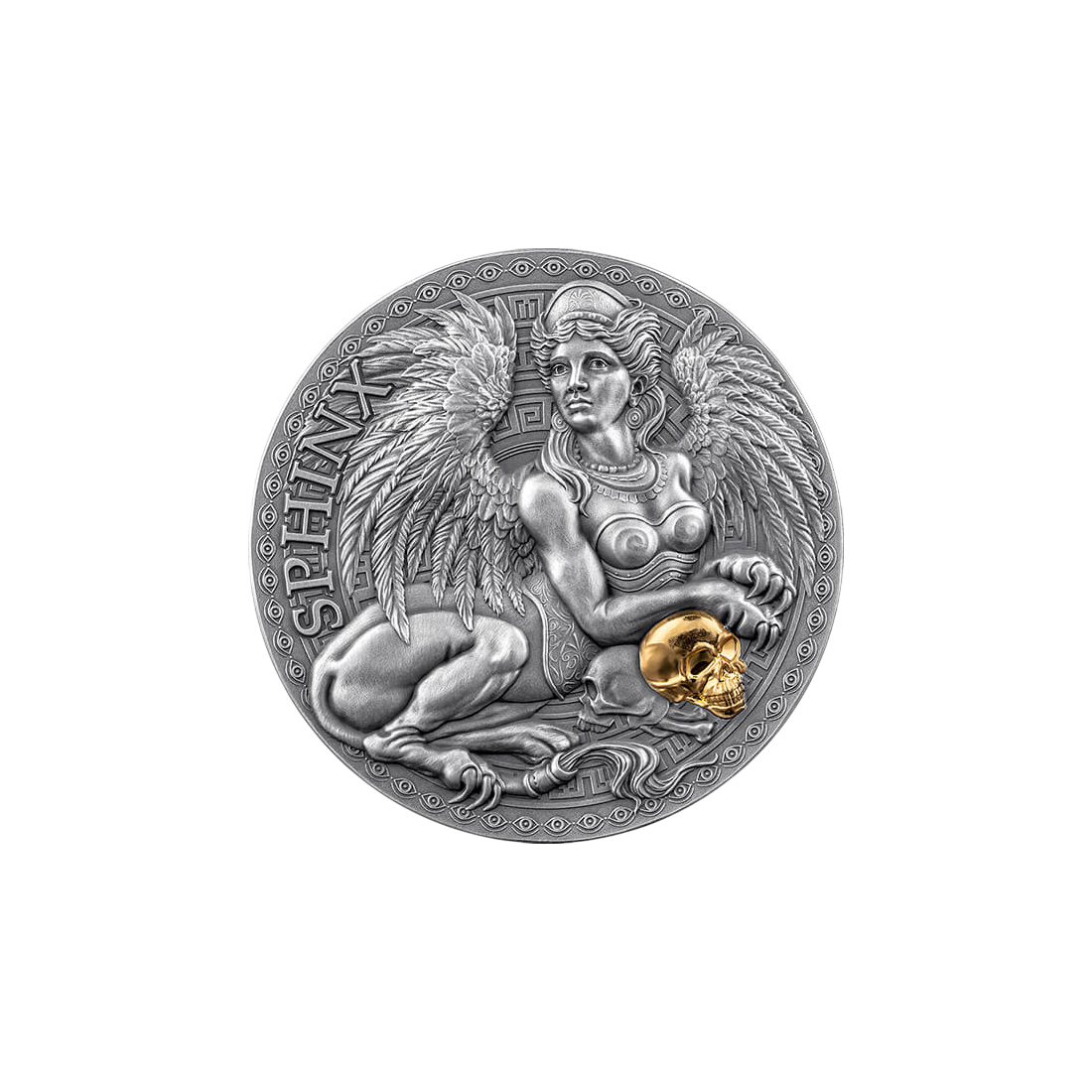 The reverse of the coin depicts the Sphinx, a mythical creature with the body of a lion and the head of a woman, which in Greek mythology personified deceit, mystery, and inexorable fate. It is a figure known primarily for mercilessly guarding the gates of Thebes and posing a riddle, the failure to solve which had deadly consequences. The central image on the coin, made using high relief technology, shows the Sphinx in a menacing pose, sitting next to human skulls – a macabre reminder of the ill-fated travelers. A unique touch is the selective gilding of one of the skulls, which not only highlights the masterful quality of the craftsmanship, but also serves as a chilling reminder of the tragic story. The coin's Antique Finish gives it a distinctive, ancient look, which further enhances the drama of the scene and the attention to artistic detail. This unique design sets this coin apart from standard bullion coins, making it a desirable item for both numismatists and investors looking for assets with above-average aesthetics.