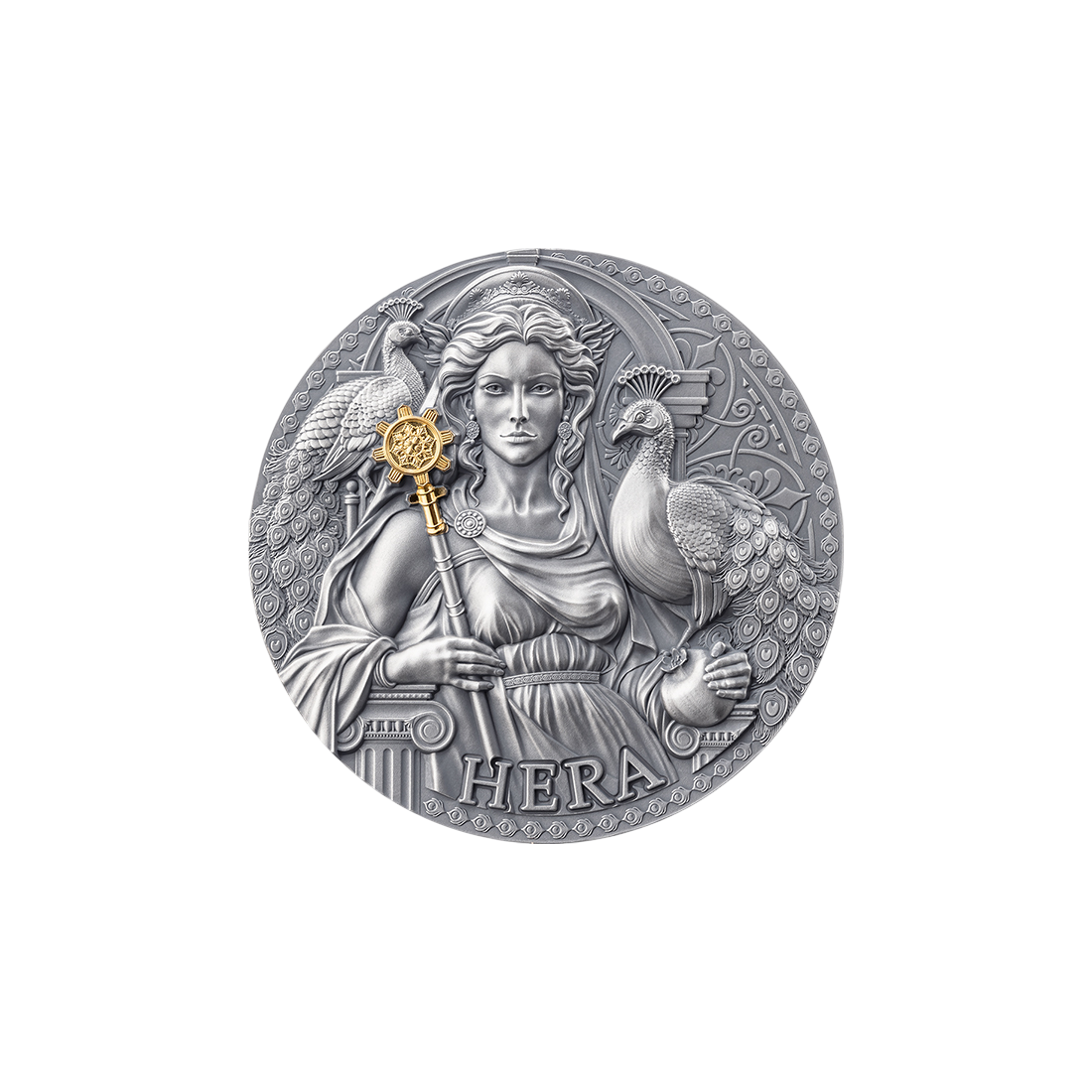 The subject of admiration is a new 3-ounce coin from the "Great Greek Mythology" series, dedicated to Hera, the venerable goddess of marriage, women, and family. This numismatic work of art from the MINT XXI mint transports the viewer straight to Mount Olympus. Hera, wife of Zeus and queen of all gods, is depicted in all her majesty, seated on her throne. In her hand she holds a gilded scepter, a symbol of her unquestionable dominance and power. The pomegranate she holds is an ancient emblem of her protective role over marital harmony, adding symbolic depth to the scene. The background of the reverse is decorated with images of sacred peacocks, birds inextricably linked to the goddess, constituting her phenomenal attribute. The high relief combined with the antique finish gives the coin an appearance similar to an ancient sculpture, emphasizing every intricate detail and building a bridge between timeless mythology and the highest class of minting craftsmanship.