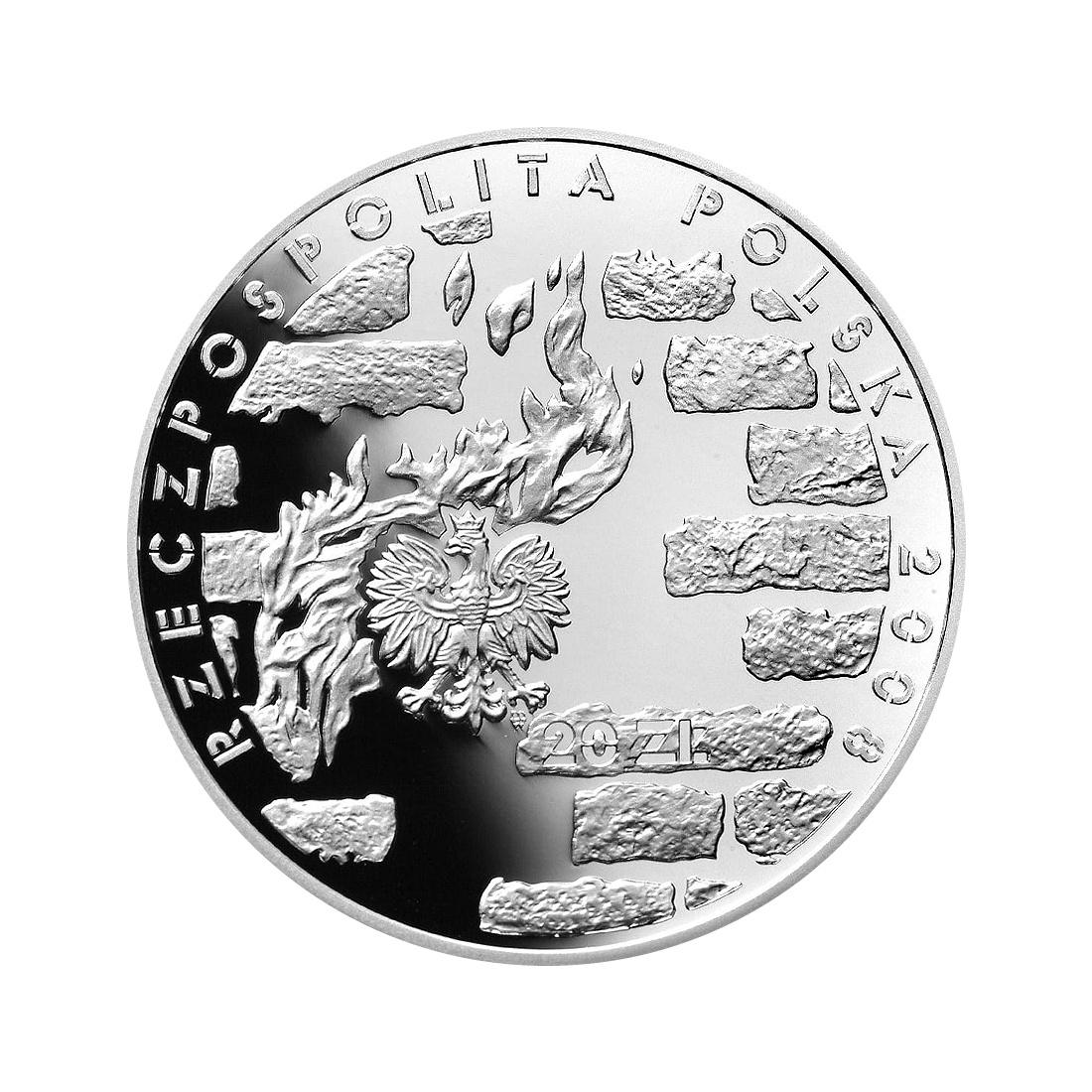 The obverse of the coin features the national emblem, placed centrally against a background of fragments of a brick wall, symbolically linking Polish statehood with the memory of the events of the uprising. The denomination appears below the eagle, and the name of the issuing country and the year of issue are located in the rim.