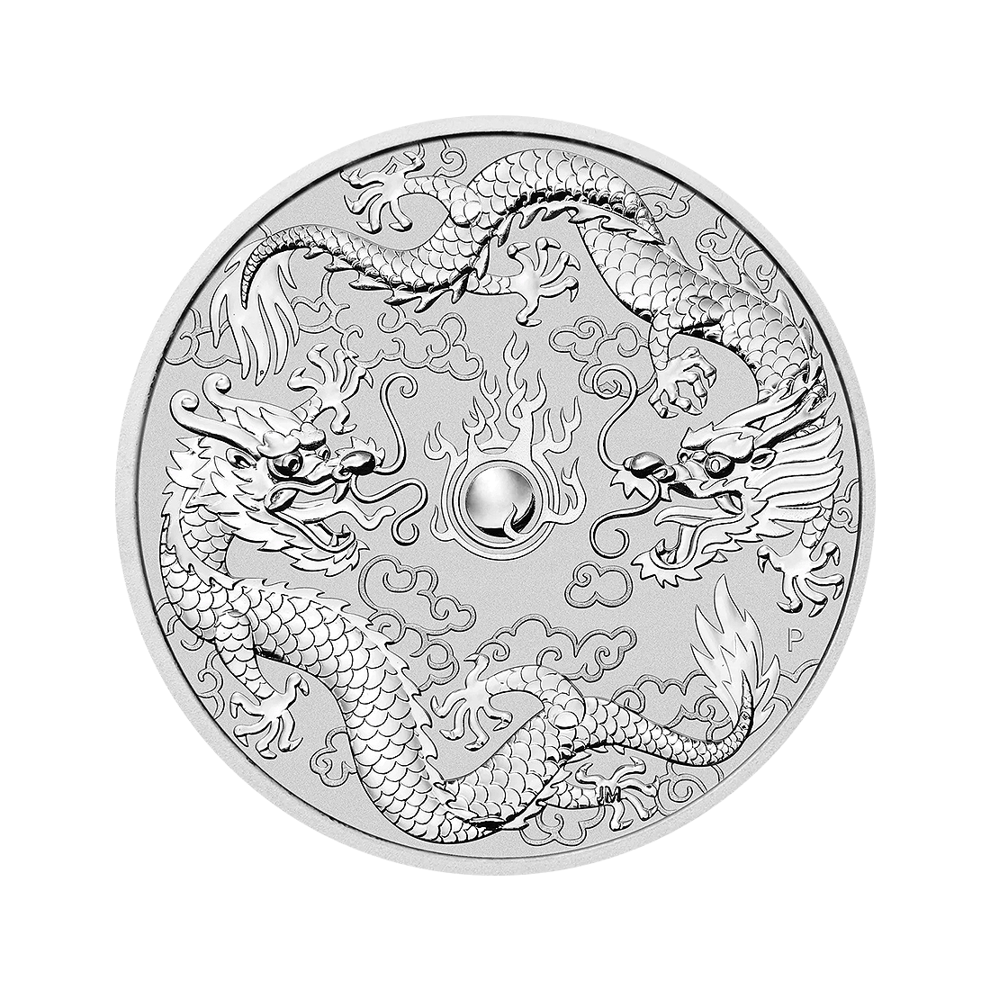 The motif of two dragons on the coin refers to Chinese tradition and mythology, in which dragons symbolize strength, power, wealth, and good fortune. The pearl between them represents spiritual light, wisdom, and protection—values that are particularly important in Chinese culture.