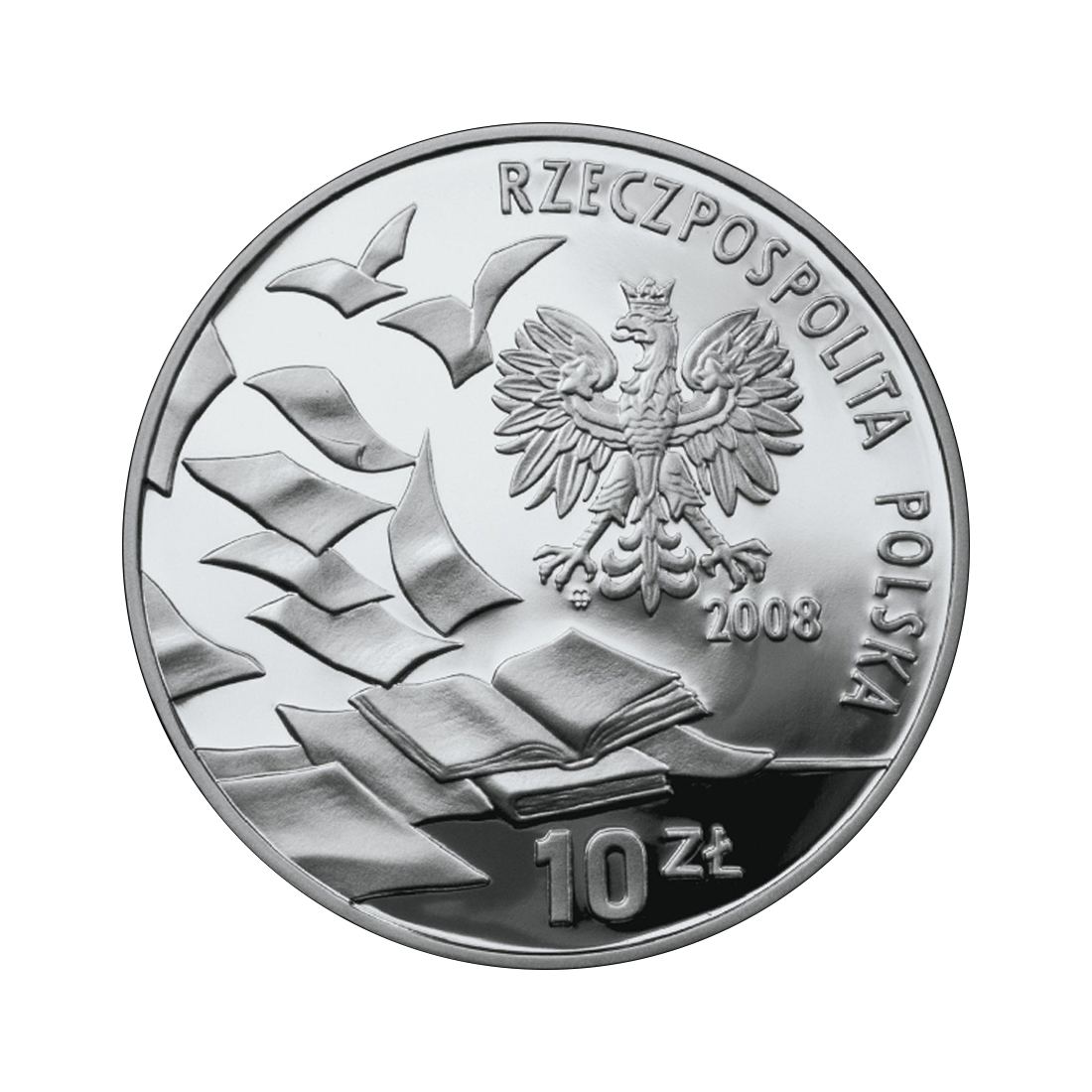 On the obverse, at the top right, there is a semicircular emblem with the inscription RZECZPOSPOLITA POLSKA (Republic of Poland). Below the eagle is the year of issue: 2008. The lower part of the coin features images of an open and closed book. This numismatic masterpiece meticulously captures the diversity of symbols and details, making it not only a collector's item, but also a unique record of Poland's cultural heritage.