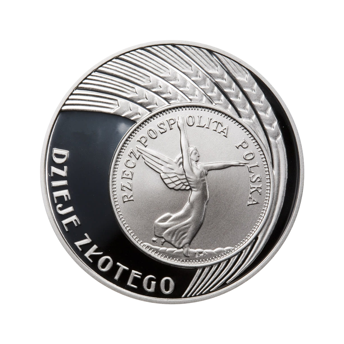 The coin is based on the historical design of the Polish five-złoty coin from 1928, where the dominant motif is Nike, the goddess of victory and freedom, with agricultural elements in the background, combining both classical symbolism and references to the interwar period in the history of Polish currency. The reverse of the coin presents the original design from 1928, featuring a winged Nike walking to the right, surrounded by stylized ears of grain, which adds dynamism to the composition and refers to the theme of prosperity and work. On the left side is the inscription "Dzieje złotego" (The History of the Złoty), which identifies the theme of the series and indicates that the coin refers to the history of the Polish currency. The obverse of the coin combines the image of the 1928 coin with Nike with additional contemporary elements: next to the stylized bust of Nike with ears of grain, there is the emblem of the Republic of Poland - a crowned eagle and inscriptions identifying the Republic of Poland and the year of issue. This composition combines a historical motif with a reference to contemporary statehood, emphasizing the origin of the design's inspiration. The entire design is characterized by the consistent use of historical iconographic numismatic motifs in an elegant layout that resembles the original 1928 design, while emphasizing the continuity of the Polish minting tradition.
