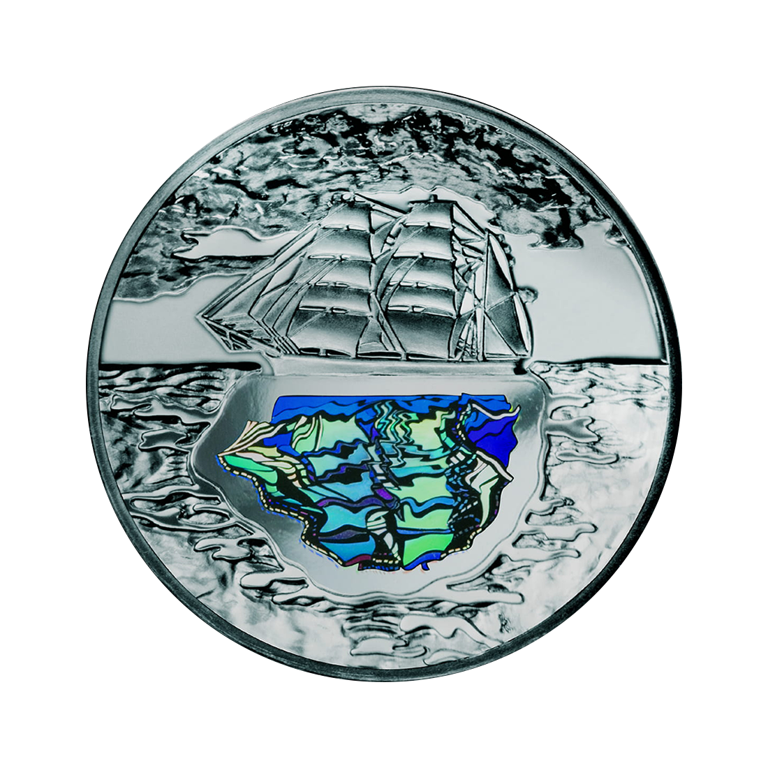 The coin has been designed with attention to detail, emphasizing both the artistic and historical dimensions of the souvenir. The reverse depicts the English ship Otago, on which Conrad sailed, symbolizing his close connection to the sea. The most striking feature of the design is the hologram, which reflects the ship in the water and changes color depending on the angle of view. This gives the coin a unique depth and modern character. The obverse features an image of Joseph Conrad Korzeniowski and his signature, which has become a recognizable symbol of the writer. The denomination of the coin is on the left, and the coat of arms of the Republic of Poland is on the right. The whole coin has been finished using the mirror stamp technique, which makes the surface smooth and shiny, further emphasizing the finesse of the design.