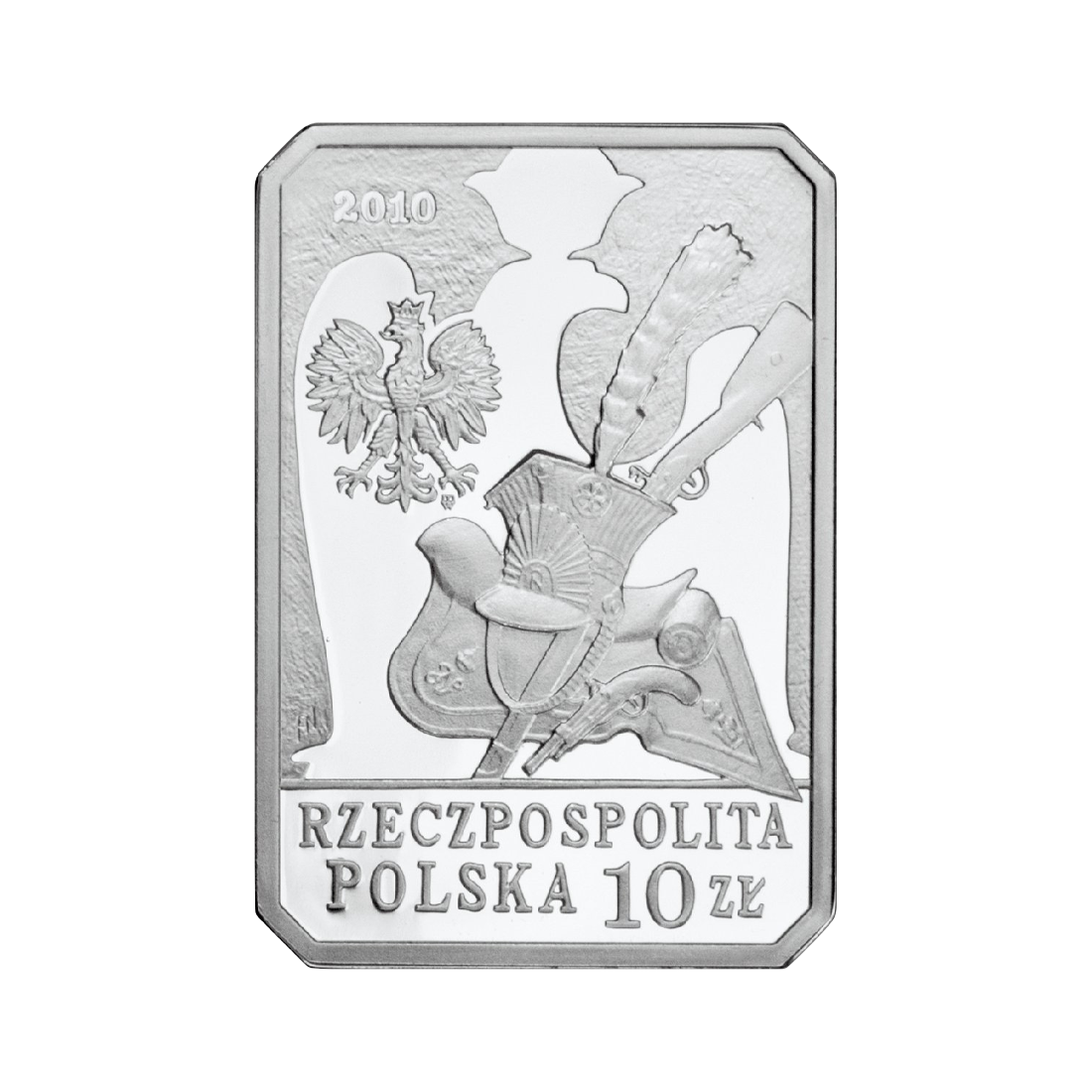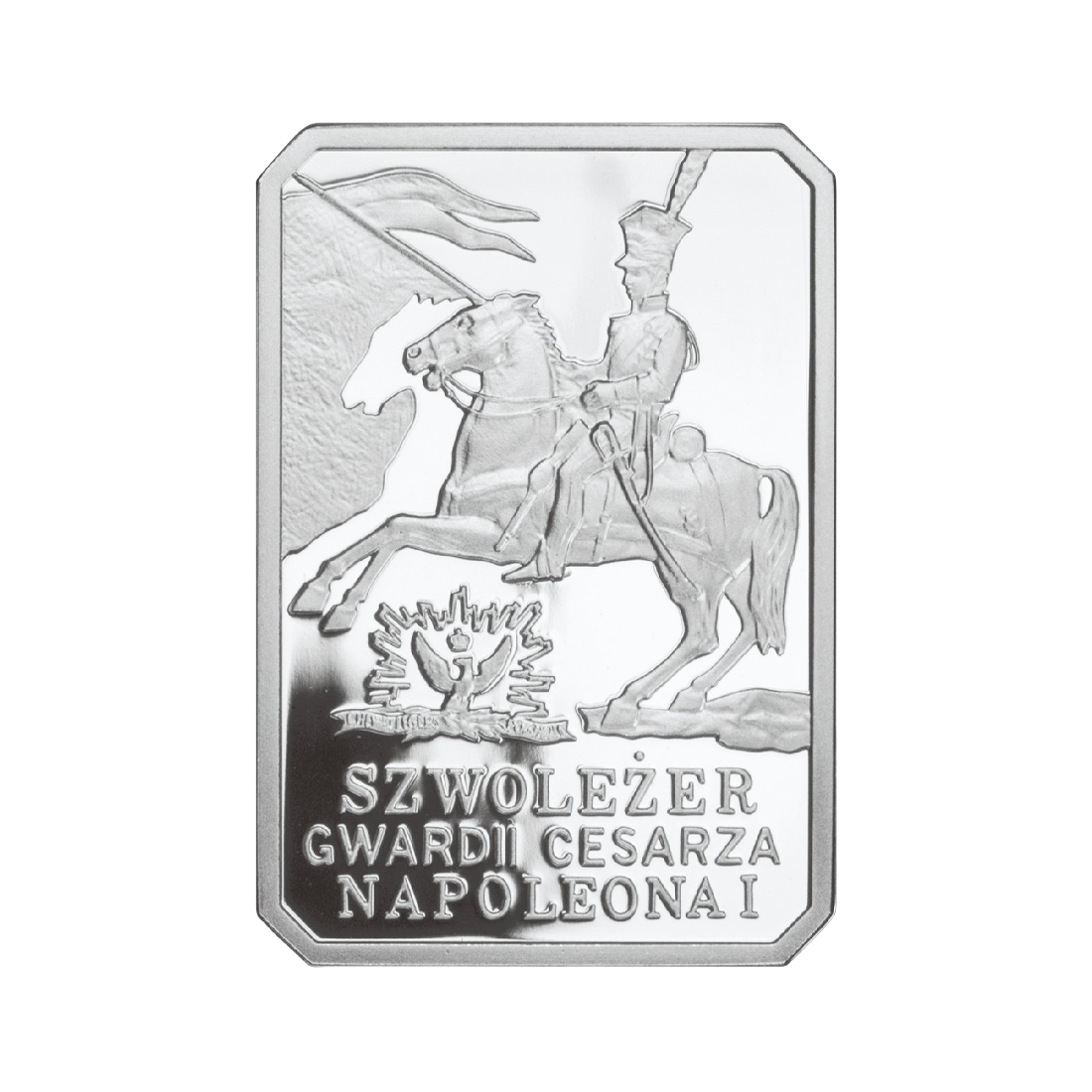 The reverse depicts a horseman with a lance and a pennant, i.e., a light cavalryman on horseback. Below, on the left, there is an eagle holding a flame, characteristic of the light cavalry regiment. At the bottom, there is an inscription: SZWOLEŻER / GWARDII CESARZA / NAPOLEONA I (Light Cavalryman / Guard of Emperor Napoleon I). As for the obverse, against the background of the outline of the Napoleonic eagle, at the top, on the left, there is an image of an eagle, the symbol of the Republic of Poland. Above the eagle, there is the year of issue: 2010. In the center, there are stylized elements of the light cavalryman's uniform and weaponry: a cap, a pistol, a rifle, a saddlecloth, and a saddle. At the bottom of the coin, there is an inscription: RZECZPOSPOLITA/ POLSKA 10 zł. Below the eagle, there is the mint mark: M/W.