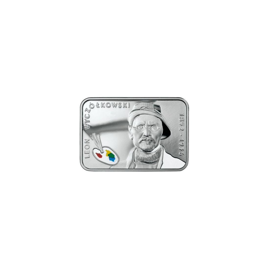 The obverse of the coin features a portrait of Leon Wyczółkowski, based on his self-portrait from 1927. In the lower left corner, there is a painter's palette with three brushes and four basic colors: red, yellow, green, and blue. Around the portrait are the inscriptions: on the left, "LEON WYCZÓŁKOWSKI," and on the right, "1852–1936."