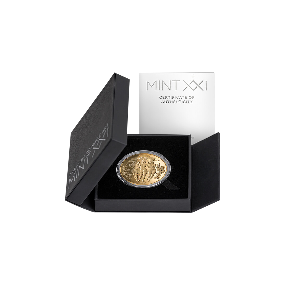 The most important feature of this issue is its exclusive finish. Unlike standard coins, the Golden Edition version is characterized by the fact that the entire surface of 999 silver has been precisely coated with a layer of pure gold. This solution gives the coin a uniform, deep shine and emphasizes its luxurious character. The use of high relief technology makes the figures of the Three Graces almost come out of the coin's surface, and the gold coating perfectly highlights every, even the smallest, sculptural detail. For investors, full gold plating guarantees the uniqueness of the product, which significantly increases its attractiveness on the secondary market and facilitates subsequent resale at a high margin.