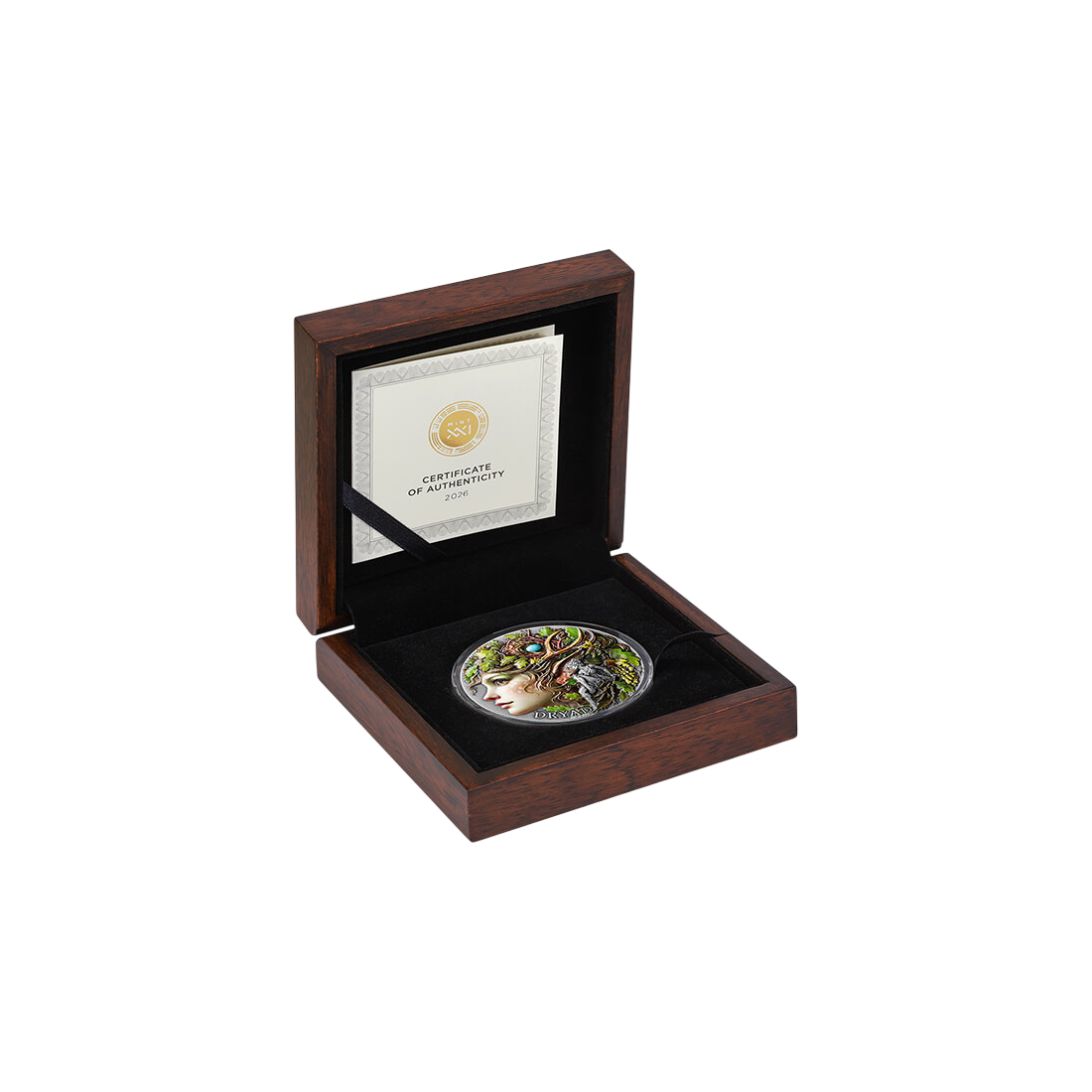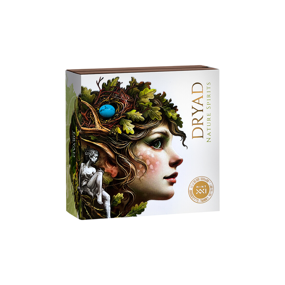 The reverse of the coin depicts the ethereal figure of Dryad, a mythical guardian of forests, whose silhouette flows smoothly into a tangle of branches and leaves. Thanks to the use of high relief, the composition gains a three-dimensional depth that almost brings the guardian of nature to life. The precise details are highlighted by an antique finish, giving the whole a noble, historical character. An additional advantage is the selective digital printing, which introduces subtle colors, and a gem insert, glistening among the roots like a hidden treasure.