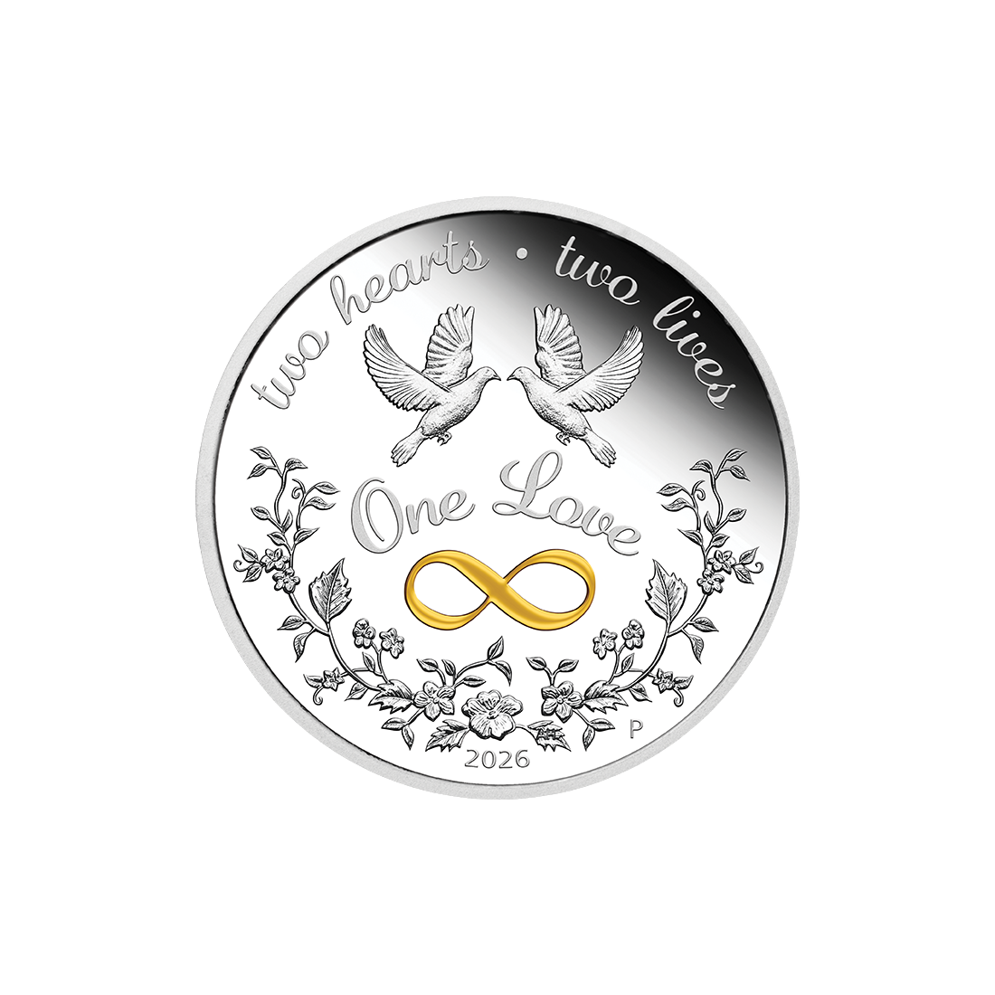The reverse side of the One Love 2026 coin catches the eye with its intricately crafted details that convey a profound message. The centerpiece of the composition is two doves, symbolizing peace and harmony, approaching each other above a gilded infinity symbol. The whole is surrounded by a delicate garland of flowers and the inscriptions "two hearts • two lives" and "One Love." The use of selective gilding and matte and mirrored surfaces (standard proof) enhances the aesthetic value of the product, making it a desirable item on the secondary market. The precision with which the birds' feathers and subtle vines have been rendered is testament to the highest minting standards.
