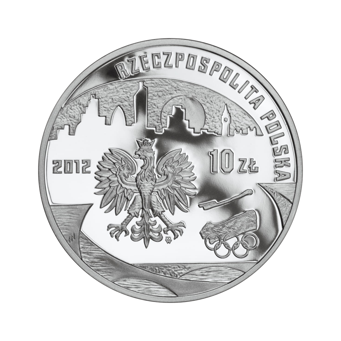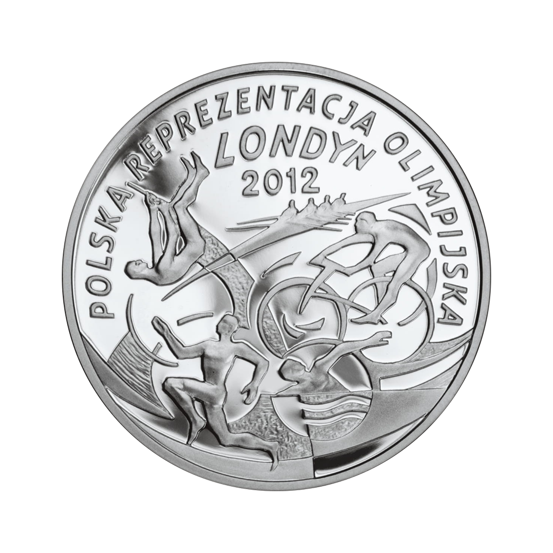 The reverse of the coin features a design depicting athletes from various sports against a background of the five Olympic rings. The inscription reads: POLISH OLYMPIC TEAM, LONDON 2012. On the obverse, against the backdrop of a city skyline, the coat of arms of Poland, the logo of the Polish Olympic Committee, the inscription RZECZPOSPOLITA POLSKA, and the coin’s denomination are depicted.