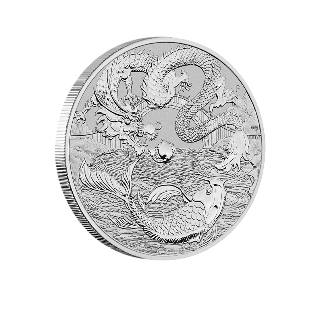 The coin is inspired by Chinese mythology and depicts a combination of two symbols deeply rooted in Eastern culture—the dragon and the koi carp.