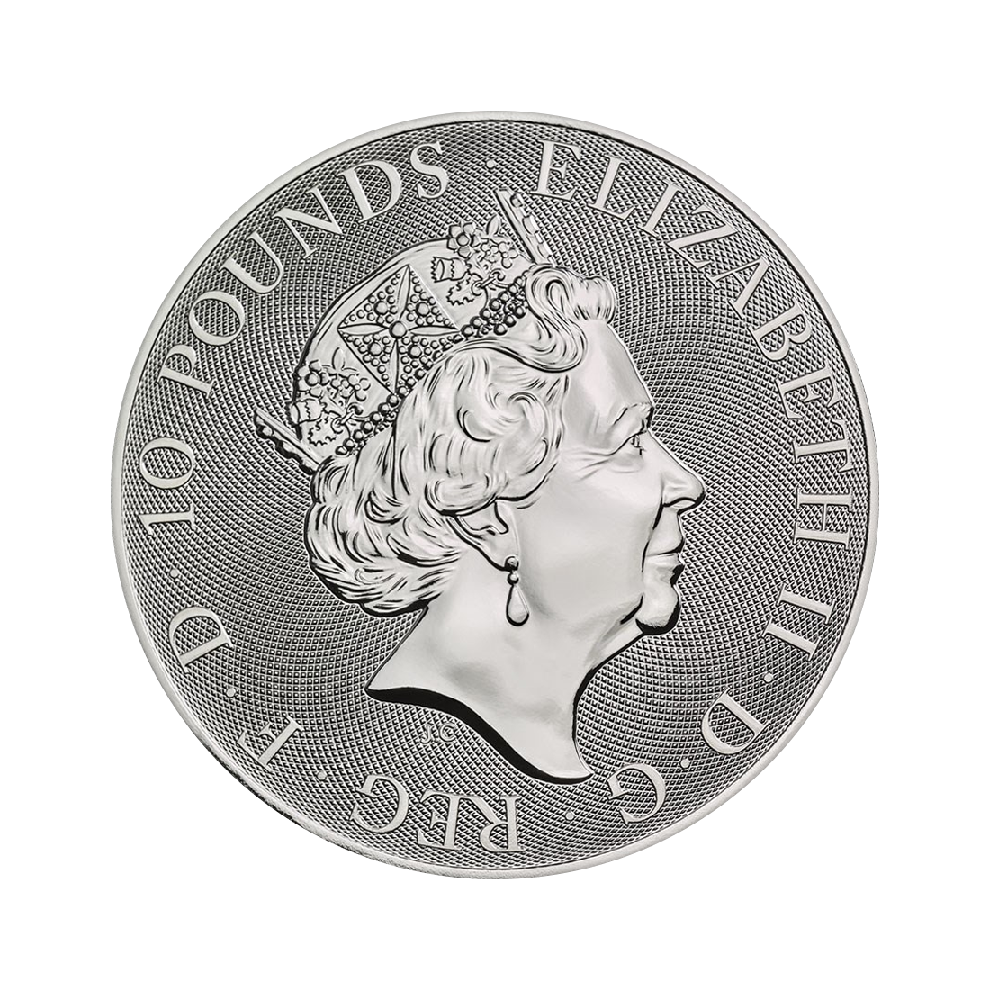 On the obverse of the Queen's Beasts bullion coin features an image of Queen Elizabeth II along with the denomination of £10. You can also find the inscription "Elizabeth II D G Reg F D," which means "Elizabeth II, by the grace of God, Queen, Defender of the Faith." This is the traditional motto used on British coins since the reign of Queen Elizabeth II.